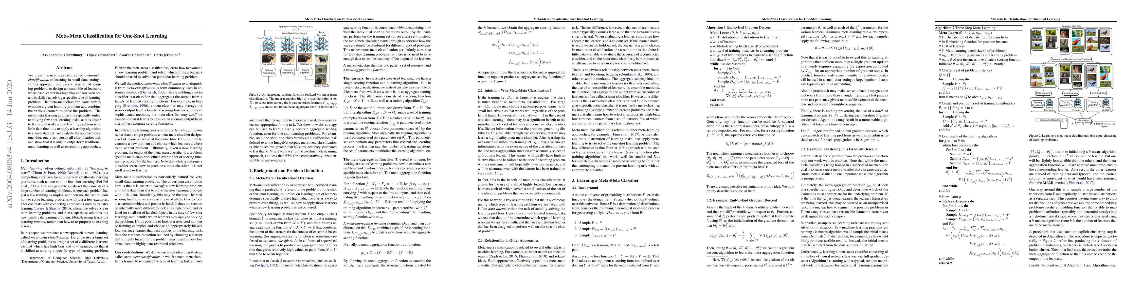 We present a new approach, called meta-meta classification, to learning in small-data settings. In this approach, one uses a large set of learning problems to design an ensemble of learners, where each learner has high bias and low variance and is skilled at solving a specific type of learning problem. The meta-meta classifier learns how to examine a given learning problem and combine the various learners to solve the problem. The meta-meta learning approach is especially suited to solving few-shot learning tasks, as it is easier to learn to classify a new learning problem with little data than it is to apply a learning algorithm to a small data set. We evaluate the approach on a one-shot, one-class-versus-all classification task and show that it is able to outperform traditional meta-learning as well as ensembling approaches.