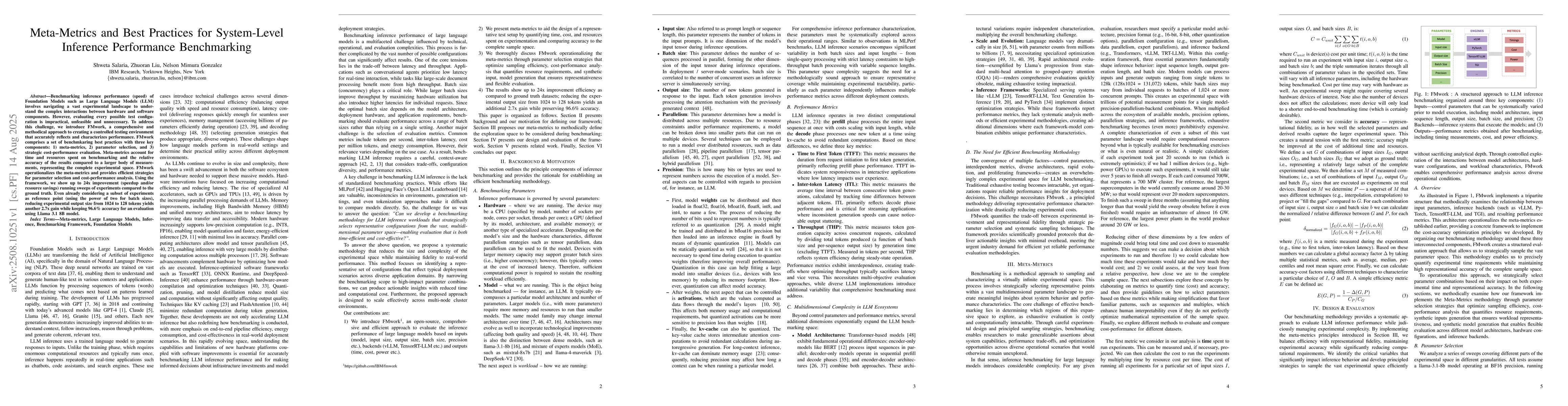 Benchmarking inference performance (speed) of Foundation Models such as Large Language Models (LLM) involves navigating a vast experimental landscape to understand the complex interactions between hardware and software components. However, evaluating every possible test configuration is impractical, unfeasible and unnecessary. To address this challenge, we introduce FMwork, a comprehensive and methodical approach to creating a controlled testing environment that accurately reflects and characterizes performance. FMwork comprises a set of benchmkaring best practices with three key components: 1) meta-metrics, 2) parameter selection, and 3) strategic cost-performance evaluation. Meta-metrics account for time and resources spent on benchmarking and the relative accuracy of the results compared to a larger body of measurements, representing the complete experimental space. FMwork operationalizes the meta-metrics and provides efficient strategies for parameter selection and cost-performance analysis. Using the framework, we show up to 24x improvement (speedup and/or resource savings) running sweeps of experiments compared to the ground truth. Even already considering a subset of experiments as reference point (using the power of two for batch sizes), reducing experimental output size from 1024 to 128 tokens yields another 2.7x gain while keeping 96.6% accuracy for an evaluation using Llama 3.1 8B model.