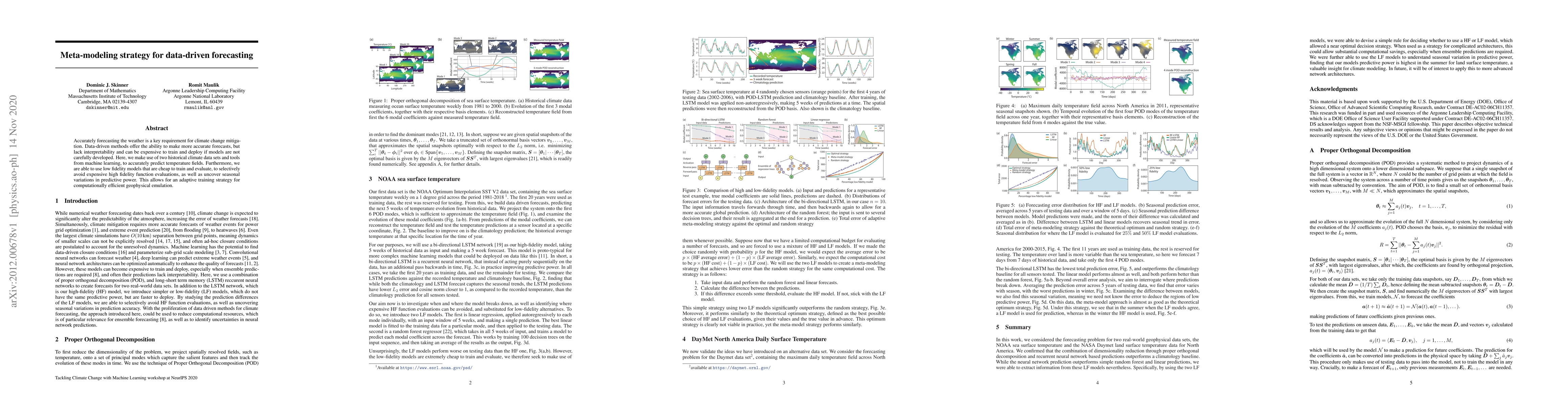 This paper proposes a meta-modeling strategy to improve data-driven weather forecasting accuracy while reducing costs and computational complexity. It uses low-fidelity models to selectively avoid expensive evaluations and uncover seasonal variations in predictive power.
