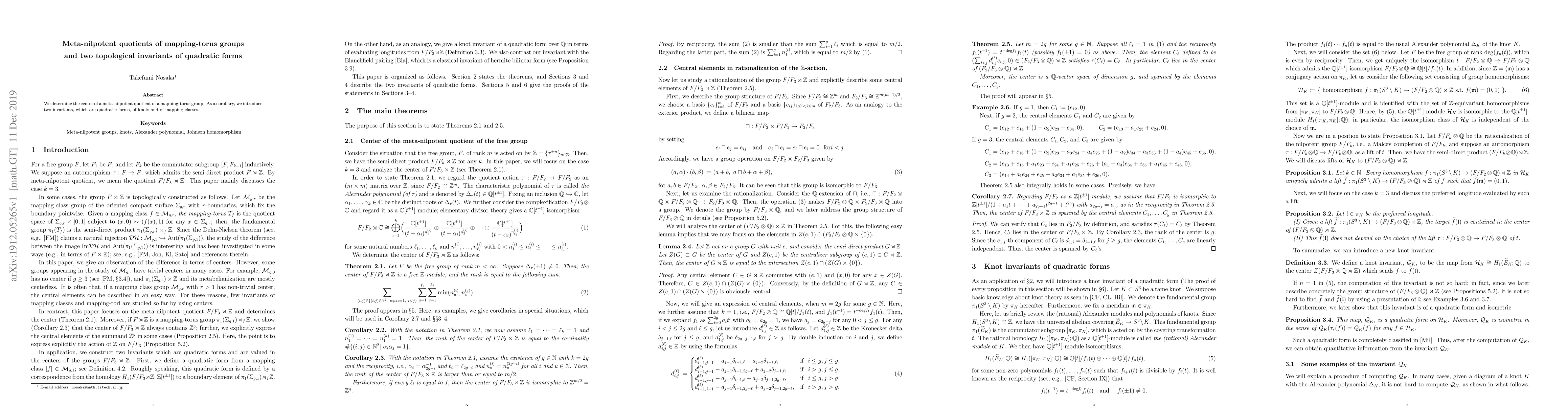 We determine the center of a meta-nilpotent quotient of a mapping-torus group. As a corollary, we introduce two invariants, which are quadratic forms, of knots and of mapping classes.