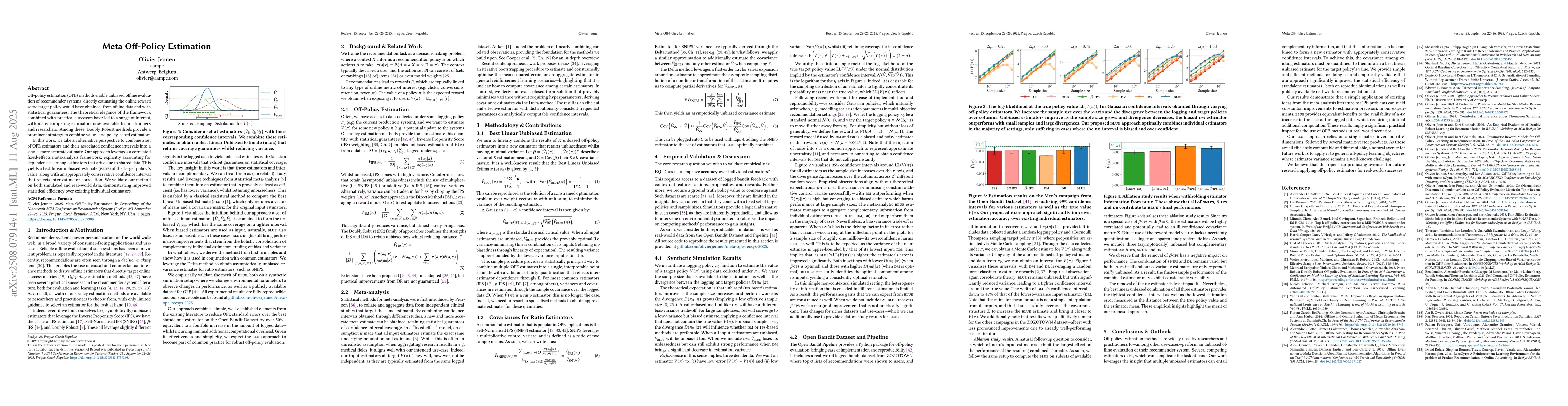 Off-policy estimation (OPE) methods enable unbiased offline evaluation of recommender systems, directly estimating the online reward some target policy would have obtained, from offline data and with statistical guarantees. The theoretical elegance of the framework combined with practical successes have led to a surge of interest, with many competing estimators now available to practitioners and researchers. Among these, Doubly Robust methods provide a prominent strategy to combine value- and policy-based estimators. In this work, we take an alternative perspective to combine a set of OPE estimators and their associated confidence intervals into a single, more accurate estimate. Our approach leverages a correlated fixed-effects meta-analysis framework, explicitly accounting for dependencies among estimators that arise due to shared data. This yields a best linear unbiased estimate (BLUE) of the target policy's value, along with an appropriately conservative confidence interval that reflects inter-estimator correlation. We validate our method on both simulated and real-world data, demonstrating improved statistical efficiency over existing individual estimators.