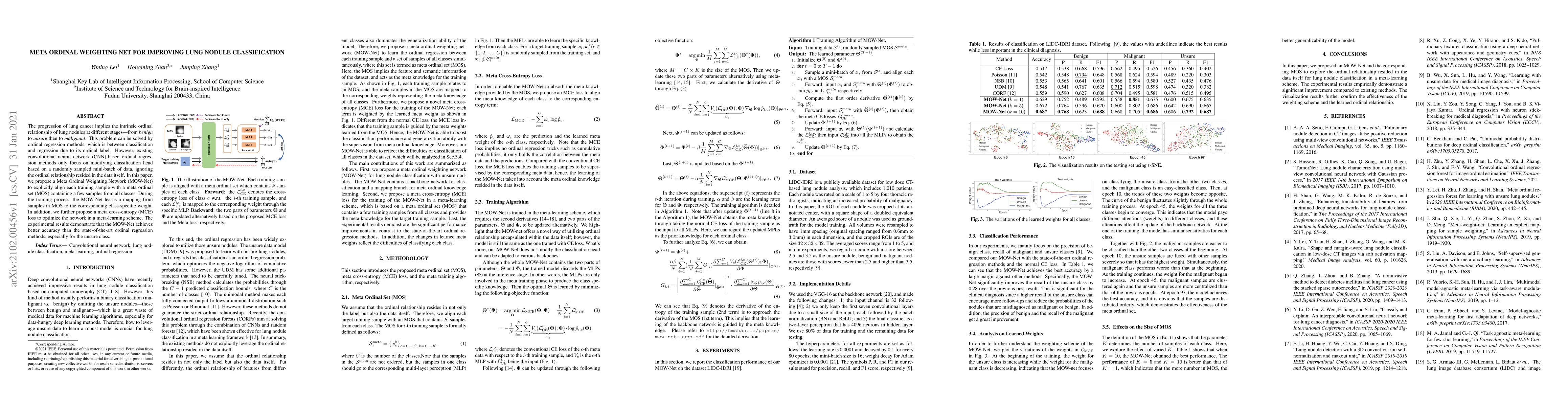 The Meta Ordinal Weighting Network (MOW-Net) proposes a novel approach to improve lung nodule classification by explicitly incorporating ordinal relationships through meta ordinal sets and a meta cross-entropy loss, achieving superior accuracy compared to existing methods.