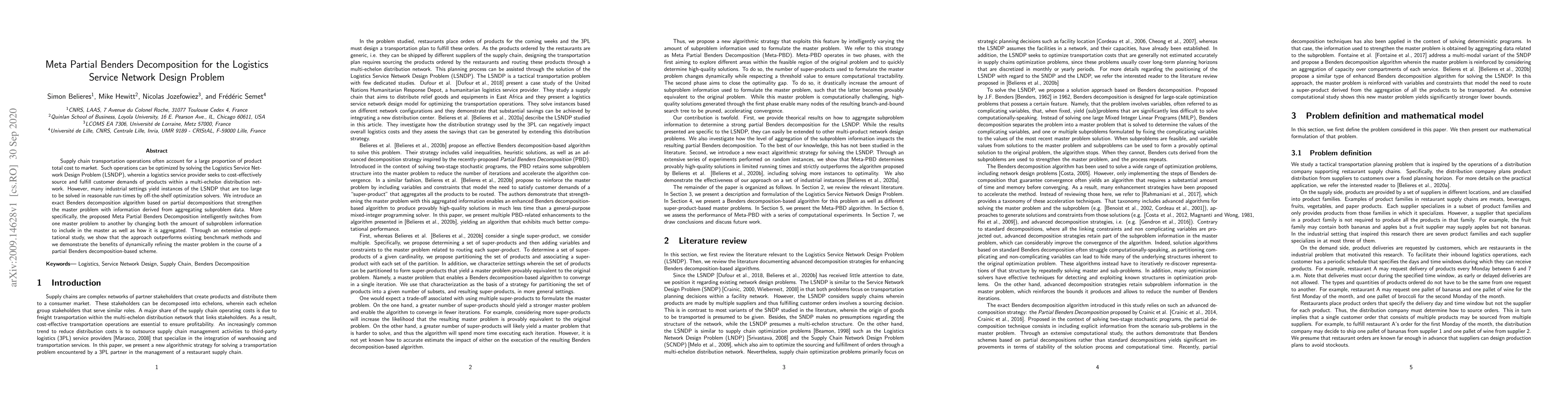 This paper proposes a Meta Partial Benders Decomposition algorithm to optimize large Logistics Service Network Design Problem (LSNDP) instances, outperforming existing methods by dynamically refining the master problem through partial decompositions and subproblem data aggregation. The approach effectively handles complex supply chain logistics operations.