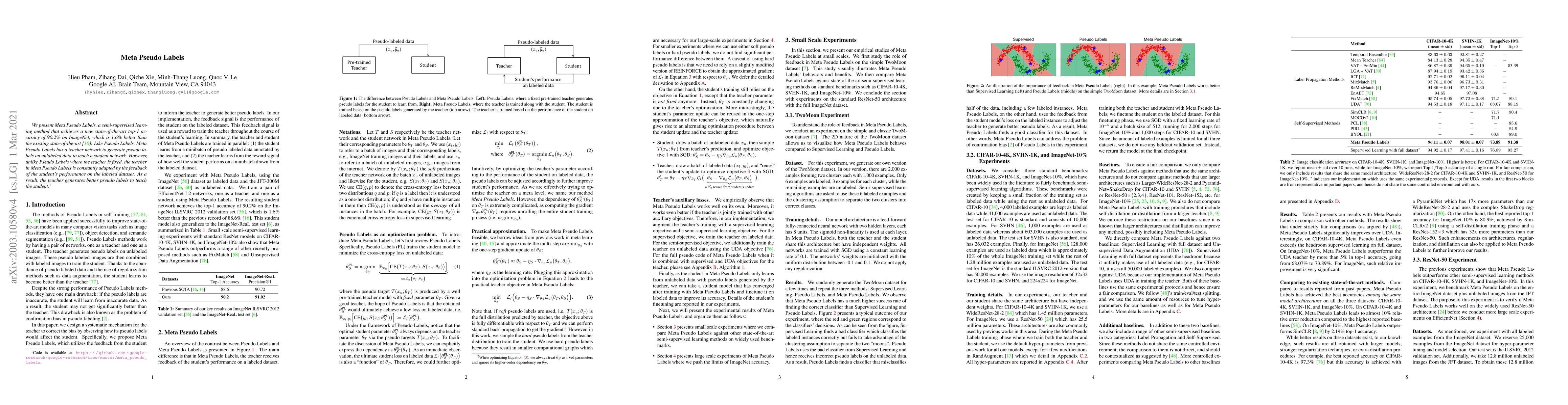 Meta Pseudo Labels introduces a semi-supervised learning method achieving a top-1 accuracy of 90.2% on ImageNet, surpassing the previous state-of-the-art by 1.6%. Unlike traditional pseudo labeling, the teacher network dynamically adapts based on the student network's performance on labeled data, generating improved pseudo labels.