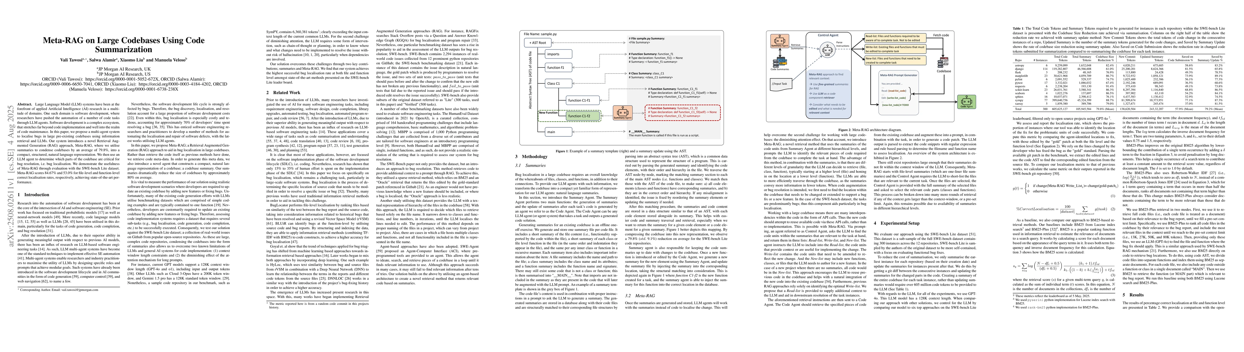 Large Language Model (LLM) systems have been at the forefront of applied Artificial Intelligence (AI) research in a multitude of domains. One such domain is software development, where researchers have pushed the automation of a number of code tasks through LLM agents. Software development is a complex ecosystem, that stretches far beyond code implementation and well into the realm of code maintenance. In this paper, we propose a multi-agent system to localize bugs in large pre-existing codebases using information retrieval and LLMs. Our system introduces a novel Retrieval Augmented Generation (RAG) approach, Meta-RAG, where we utilize summaries to condense codebases by an average of 79.8\%, into a compact, structured, natural language representation. We then use an LLM agent to determine which parts of the codebase are critical for bug resolution, i.e. bug localization. We demonstrate the usefulness of Meta-RAG through evaluation with the SWE-bench Lite dataset. Meta-RAG scores 84.67 % and 53.0 % for file-level and function-level correct localization rates, respectively, achieving state-of-the-art performance.