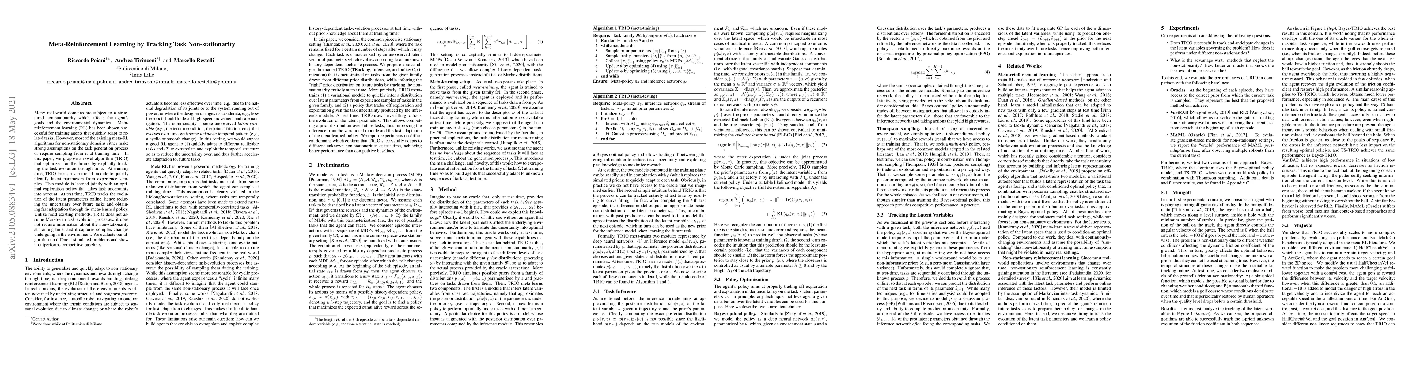 This paper introduces TRIO, a novel meta-reinforcement learning algorithm that tracks task non-stationarity over time without requiring assumptions about the task generation process or training-time sampling. TRIO employs a variational module to identify latent parameters and an optimal exploration policy, achieving fast adaptation to future tasks.