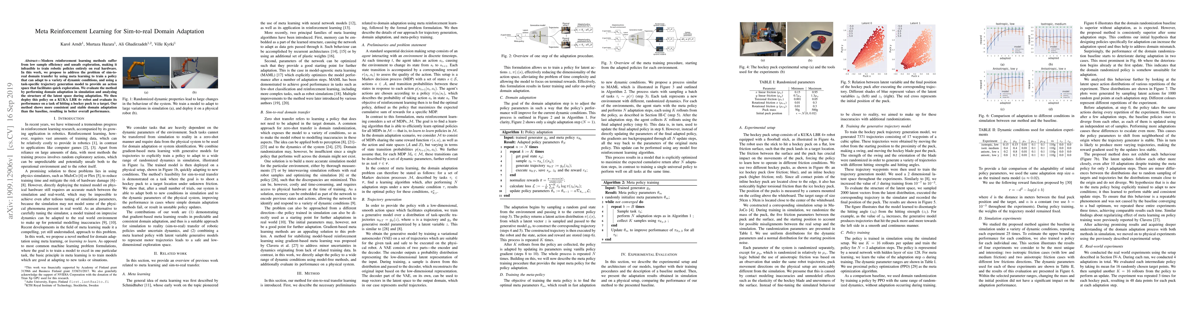 This paper proposes a meta reinforcement learning approach to enhance sim-to-real domain adaptation for robotics, utilizing a task-specific trajectory generation model for efficient exploration. The method demonstrates superior performance and stability in adapting to real-world conditions, as evidenced by successful puck-hitting trials on a KUKA robot.
