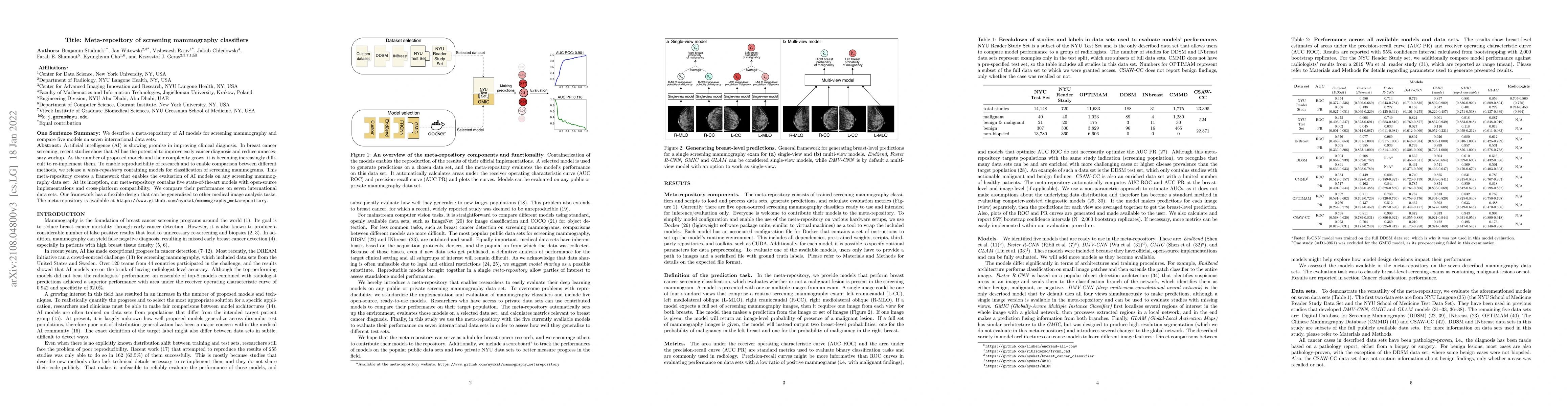 Artificial intelligence (AI) is showing promise in improving clinical diagnosis. In breast cancer screening, recent studies show that AI has the potential to improve early cancer diagnosis and reduce unnecessary workup. As the number of proposed models and their complexity grows, it is becoming increasingly difficult to re-implement them. To enable reproducibility of research and to enable comparison between different methods, we release a meta-repository containing models for classification of screening mammograms. This meta-repository creates a framework that enables the evaluation of AI models on any screening mammography data set. At its inception, our meta-repository contains five state-of-the-art models with open-source implementations and cross-platform compatibility. We compare their performance on seven international data sets. Our framework has a flexible design that can be generalized to other medical image analysis tasks. The meta-repository is available at https://www.github.com/nyukat/mammography_metarepository.