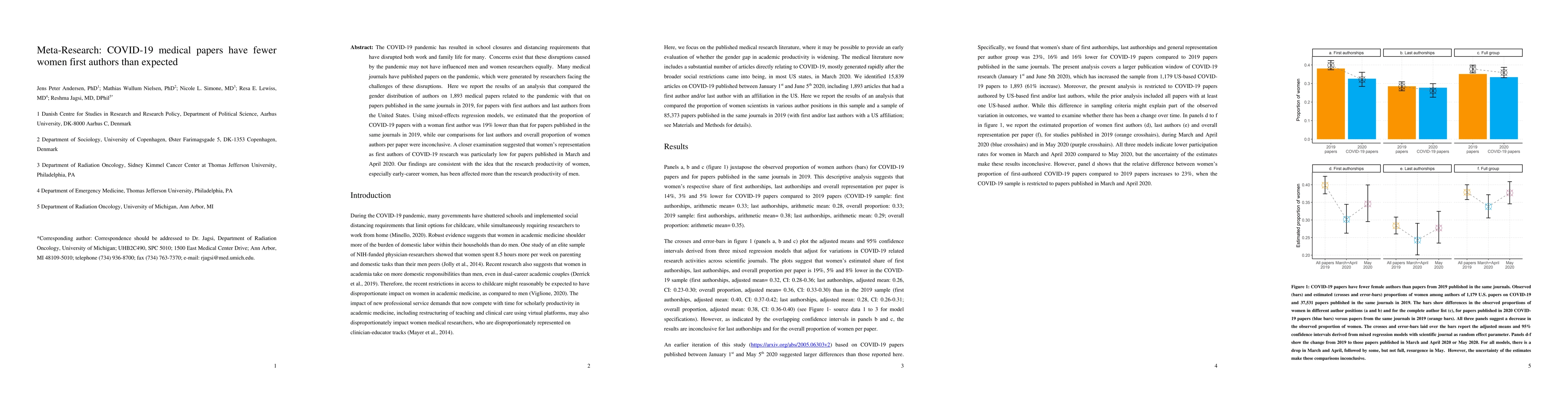 A study found that COVID-19 medical papers had 19% fewer female first authors than expected, suggesting the pandemic's impact on women researchers' productivity may have been more severe.