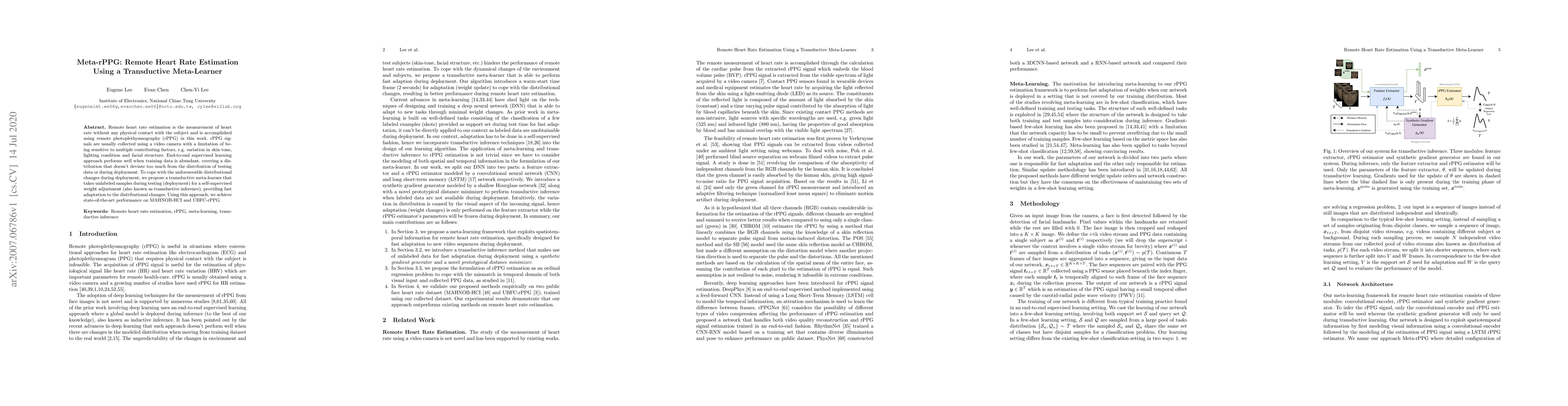 This paper proposes a transductive meta-learner for remote heart rate estimation using rPPG, which adapts to distributional changes during deployment by adjusting weights with unlabeled samples. The method achieves state-of-the-art performance on benchmark datasets.