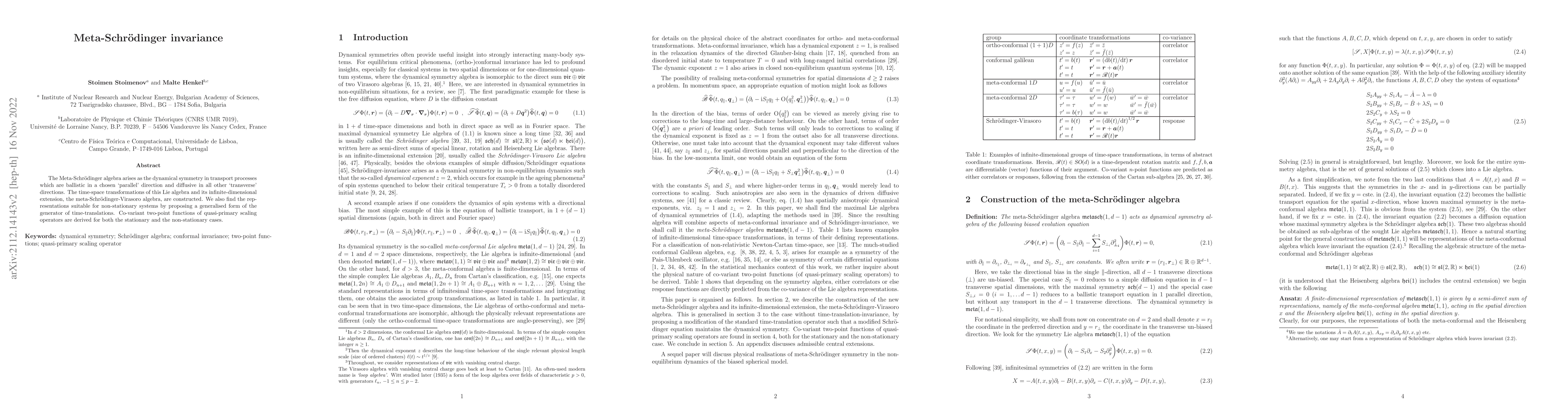 The Meta-Schrödinger algebra is identified as the dynamical symmetry in transport processes with ballistic and diffusive characteristics. The paper constructs the transformations of this algebra and its infinite-dimensional extension, deriving covariant two-point functions for quasi-primary scaling operators in both stationary and non-stationary systems.