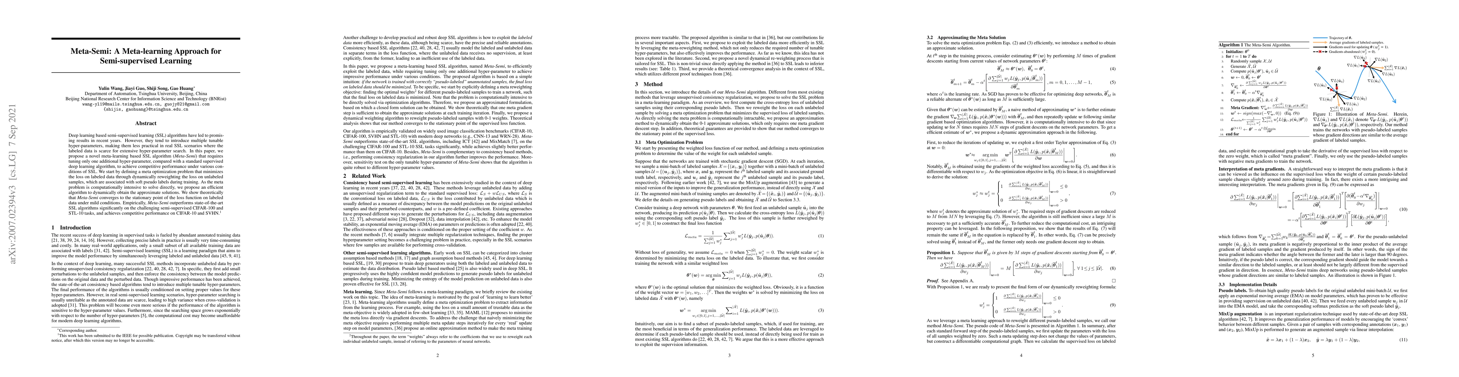 This paper introduces Meta-Semi, a meta-learning approach for semi-supervised learning that requires only one additional hyper-parameter compared to supervised learning, achieving competitive performance with fewer tuning challenges. The method dynamically reweights unlabeled data losses using soft pseudo labels, and an efficient algorithm is proposed to solve the computationally intensive meta optimization problem, demonstrating superior results on several semi-supervised datasets.