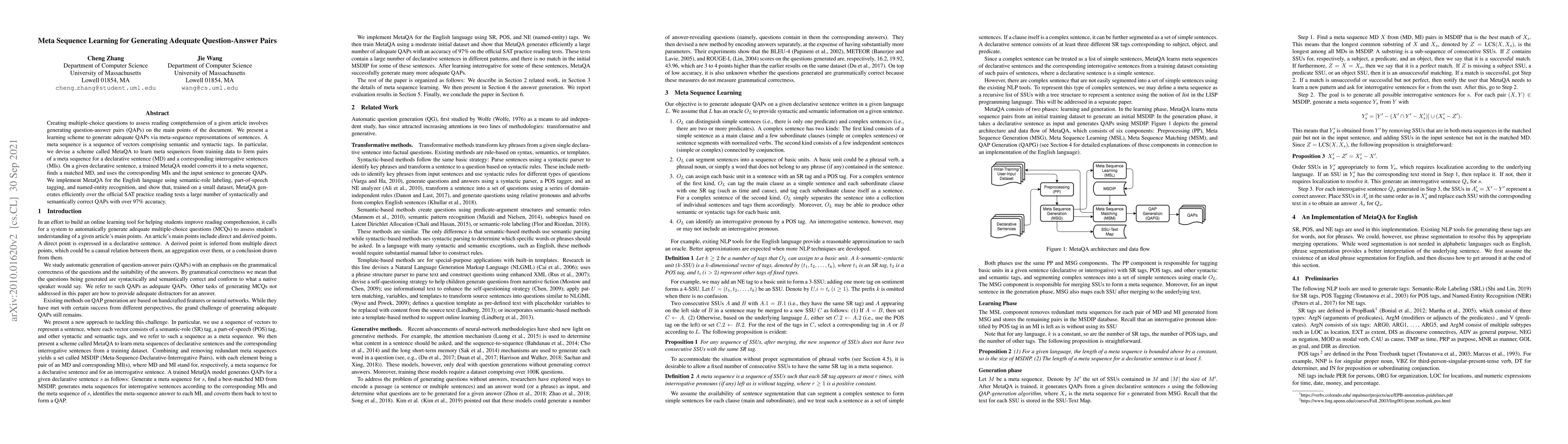 This paper introduces MetaQA, a learning scheme that generates adequate question-answer pairs (QAPs) by converting declarative sentences into meta sequences, which combine semantic and syntactic tags. Trained on a small dataset, MetaQA efficiently produces syntactically and semantically correct QAPs with over 97% accuracy for SAT practice reading tests.