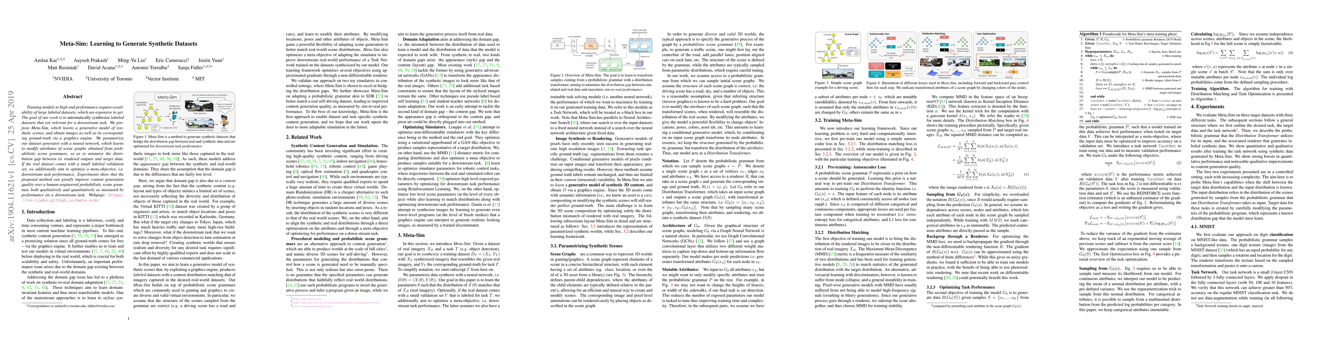 Training models to high-end performance requires availability of large labeled datasets, which are expensive to get. The goal of our work is to automatically synthesize labeled datasets that are relevant for a downstream task. We propose Meta-Sim, which learns a generative model of synthetic scenes, and obtain images as well as its corresponding ground-truth via a graphics engine. We parametrize our dataset generator with a neural network, which learns to modify attributes of scene graphs obtained from probabilistic scene grammars, so as to minimize the distribution gap between its rendered outputs and target data. If the real dataset comes with a small labeled validation set, we additionally aim to optimize a meta-objective, i.e. downstream task performance. Experiments show that the proposed method can greatly improve content generation quality over a human-engineered probabilistic scene grammar, both qualitatively and quantitatively as measured by performance on a downstream task.