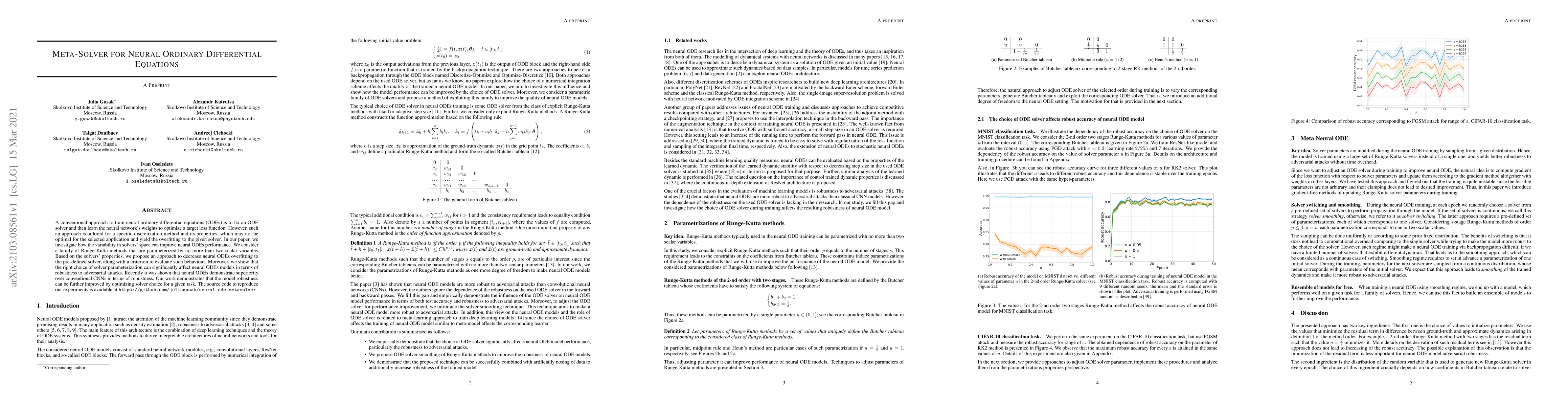 This paper proposes a meta-solver approach to train neural ordinary differential equations (ODEs) by optimizing solver parameterization, aiming to reduce overfitting and improve model robustness. The study demonstrates that selecting the appropriate solver can significantly enhance neural ODEs' performance and robustness against adversarial attacks.