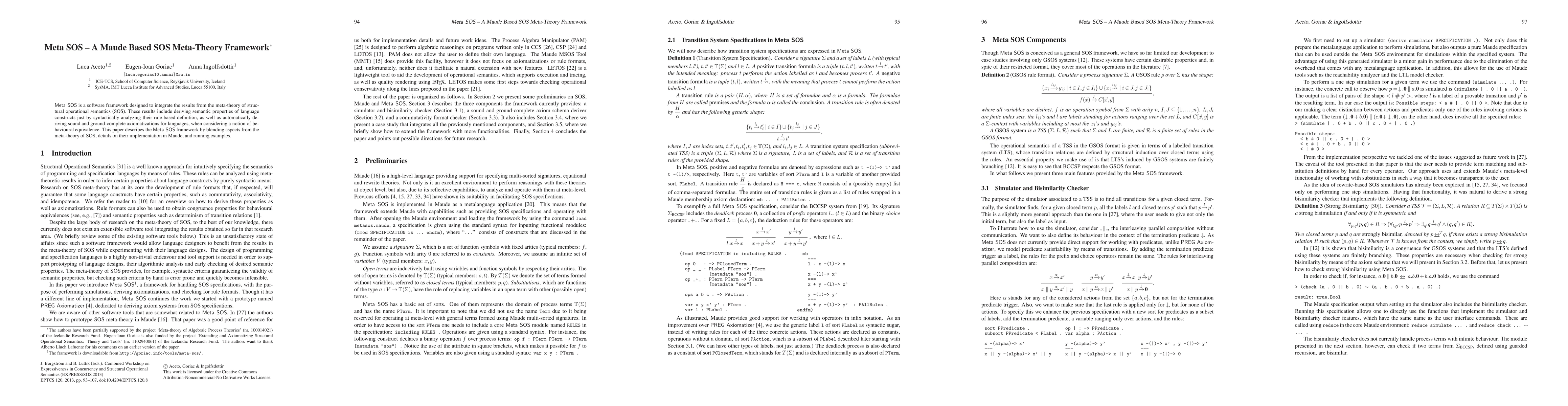 Meta SOS is a framework in Maude that automates the derivation of semantic properties and axiomatizations for languages using structural operational semantics (SOS). It exemplifies the integration of meta-theory and practical implementation through detailed examples.