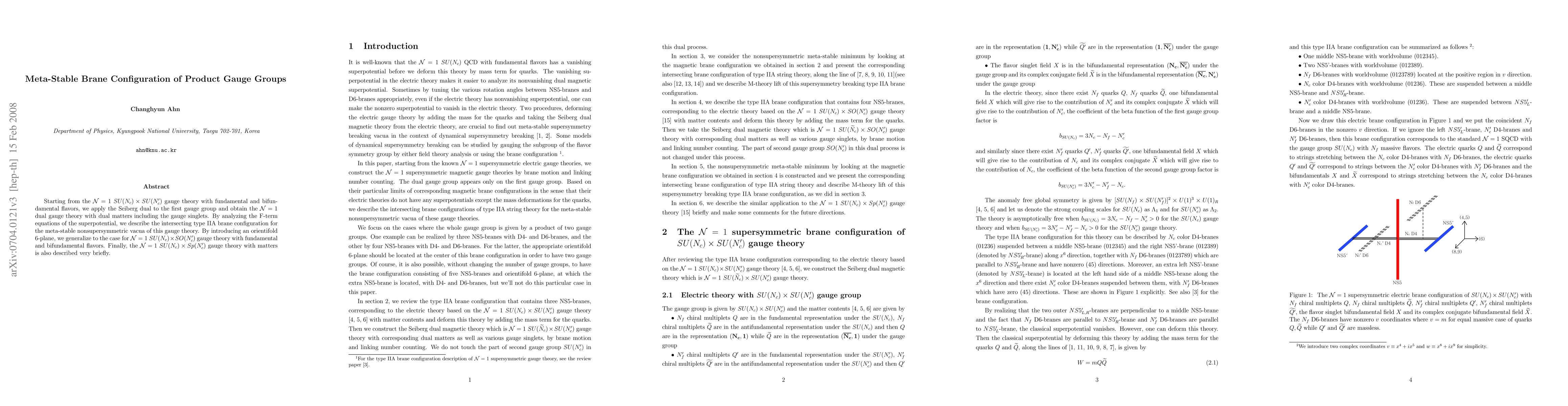 This paper explores the meta-stable brane configurations of product gauge groups, starting with N=1 SU(N_c) x SU(N_c') gauge theory and applying the Seiberg duality to derive dual matters. It describes intersecting type IIA brane configurations for meta-stable nonsupersymmetric vacua and generalizes the analysis to N=1 SU(N_c) x SO(N_c') and SU(N_c) x Sp(N_c') gauge theories.