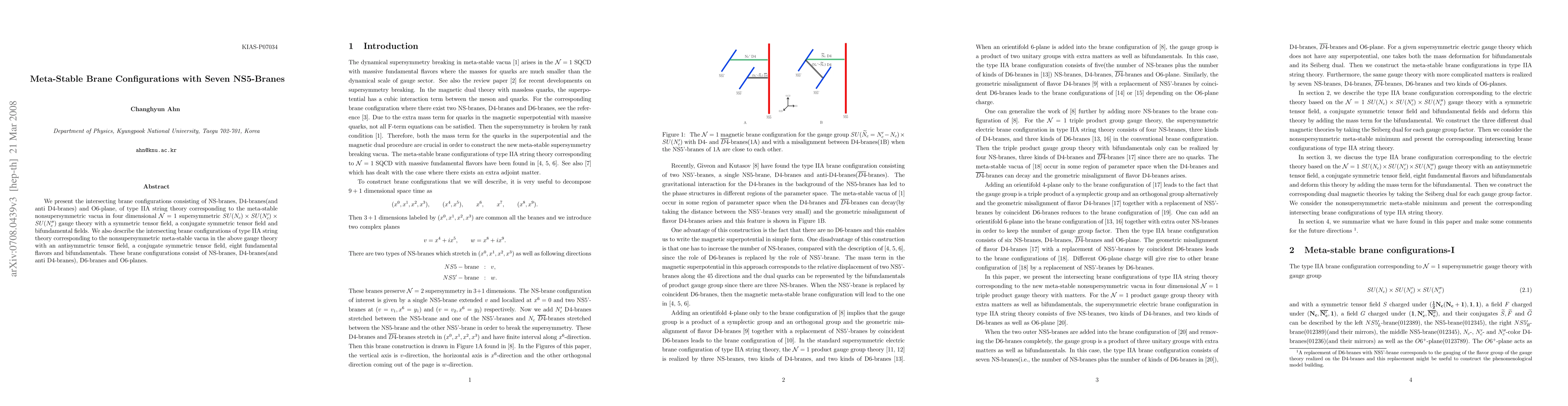 This paper explores intersecting brane configurations in type IIA string theory, involving NS-branes, D4-branes, anti-D4-branes, and O6-planes, that correspond to meta-stable nonsupersymmetric vacua in four-dimensional N=1 supersymmetric gauge theories. It also describes similar configurations with D6-branes for additional antisymmetric tensor fields and flavors.