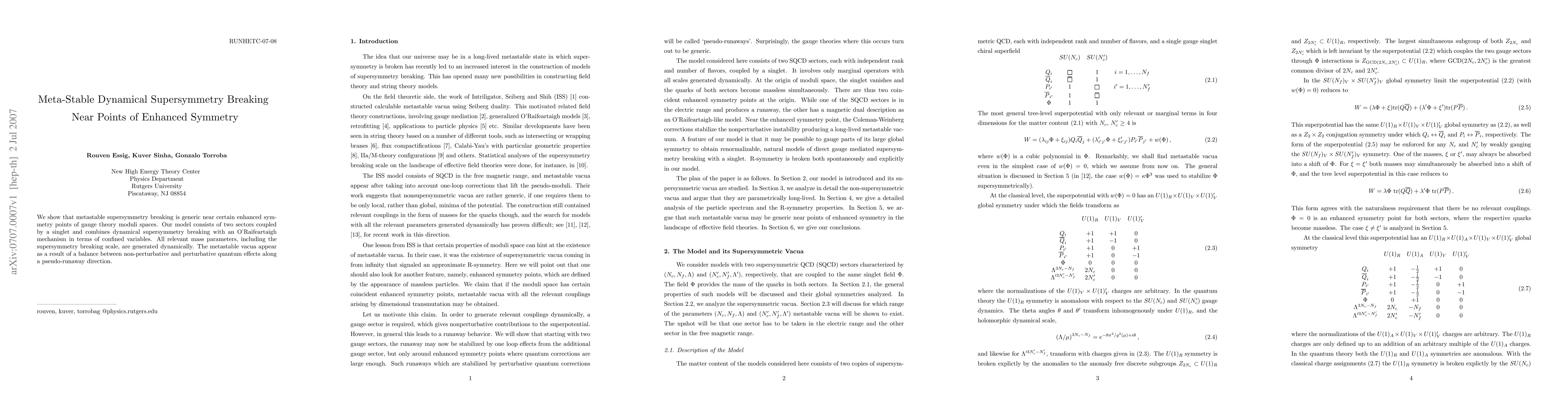 This paper demonstrates that metastable supersymmetry breaking is common near enhanced symmetry points of gauge theory moduli spaces, achieved through a combination of dynamical breaking and an O'Raifeartaigh mechanism. The model dynamically generates mass parameters, including the supersymmetry breaking scale, with metastable vacua resulting from a balance of quantum effects.