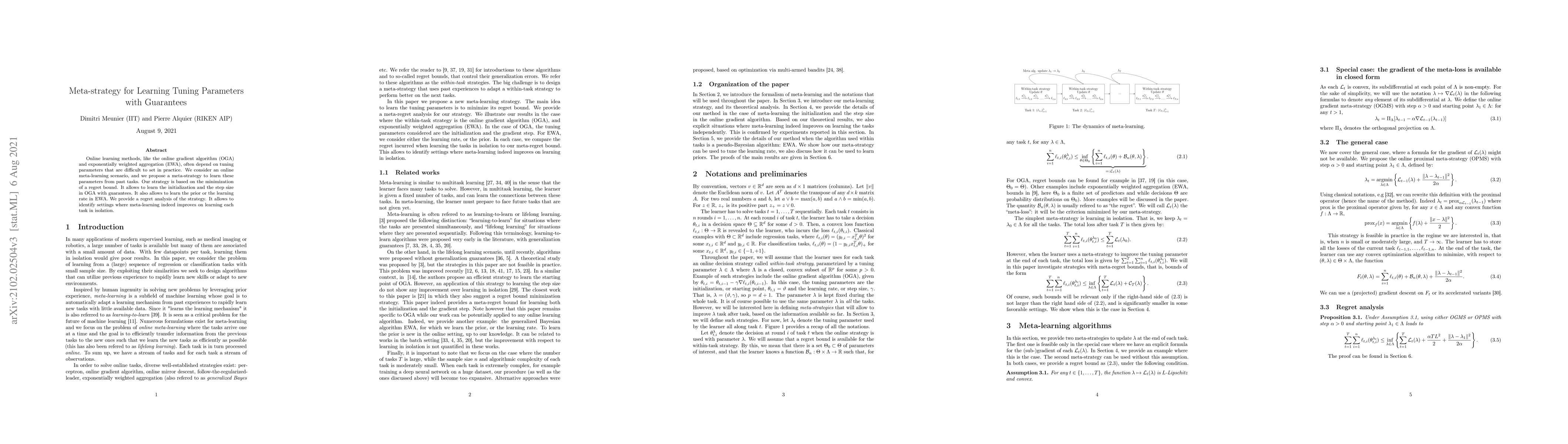 The paper proposes meta-learning strategies for learning tuning parameters in online learning methods such as Online Gradient Algorithm (OGA) and Exponentially Weighted Aggregation (EWA). It formulates the problem as a minimization of a regret bound and provides a theoretical analysis.