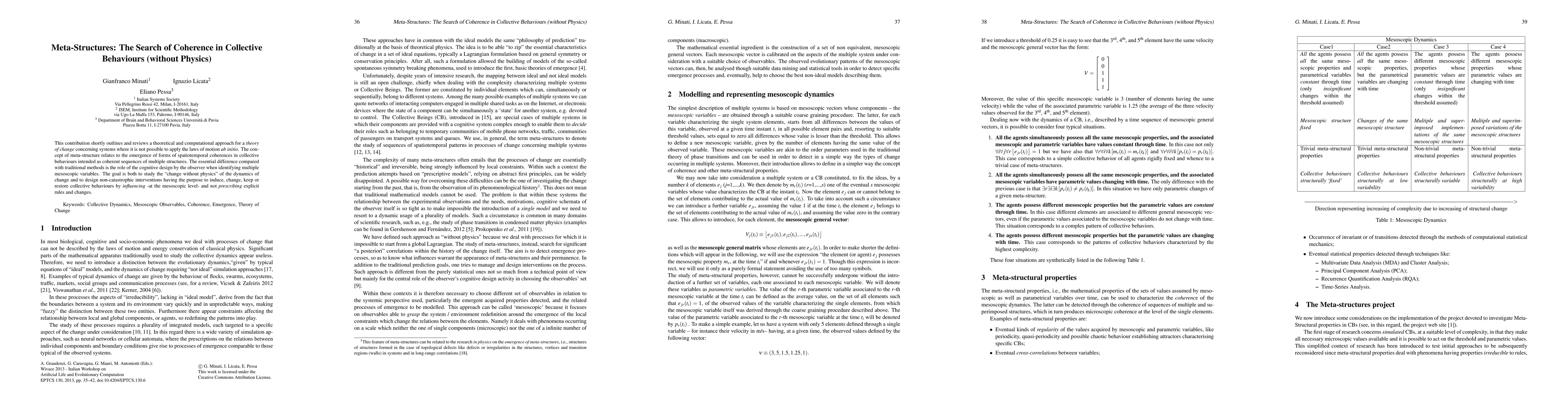 This contribution shortly outlines and reviews a theoretical and computational approach for a theory of change concerning systems where it is not possible to apply the laws of motion ab initio. The concept of meta-structure relates to the emergence of forms of spatiotemporal coherences in collective behaviours intended as coherent sequences of multiple structures. The essential difference compared with traditional methods is the role of the cognitive design by the observer when identifying multiple mesoscopic variables. The goal is both to study the "change without physics" of the dynamics of change and to design non-catastrophic interventions having the purpose to induce, change, keep or restore collective behaviours by influencing -at the mesoscopic level -and not prescribing explicit rules and changes.
