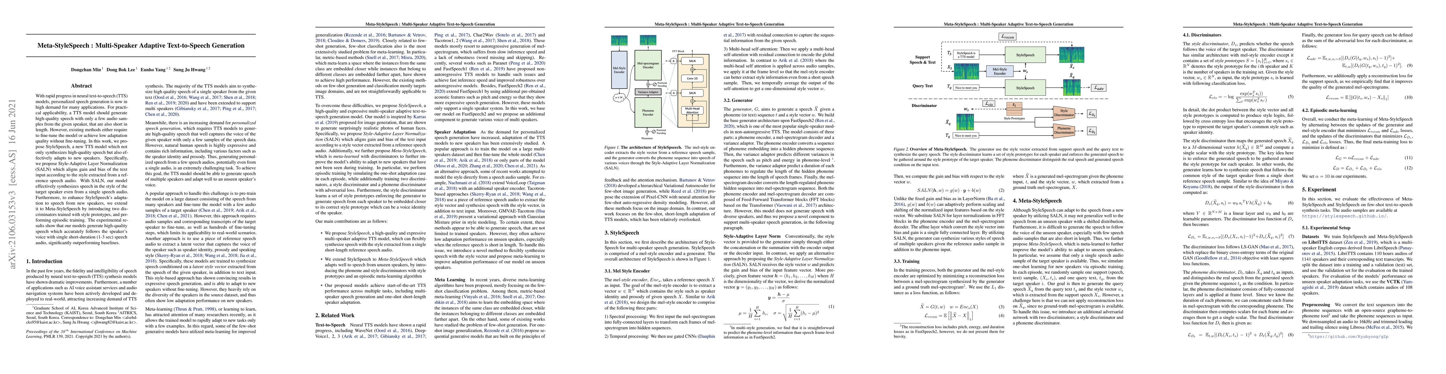 This paper introduces Meta-StyleSpeech, a neural text-to-speech model that synthesizes high-quality speech and effectively adapts to new speakers using only a few short audio samples. The proposed Style-Adaptive Layer Normalization (SALN) and episodic training with discriminators enhance adaptation quality, outperforming existing methods.