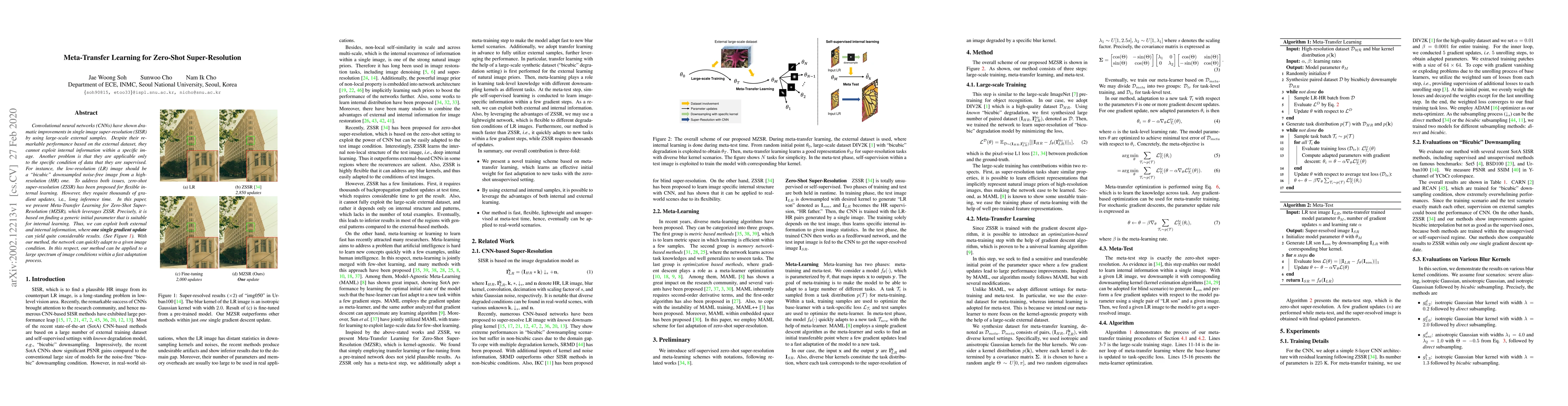 This paper introduces Meta-Transfer Learning for Zero-Shot Super-Resolution (MZSR) to address limitations of traditional CNNs in super-resolution tasks. MZSR leverages zero-shot learning to quickly adapt to new image conditions with minimal gradient updates, combining both external and internal image information for efficient and flexible super-resolution.