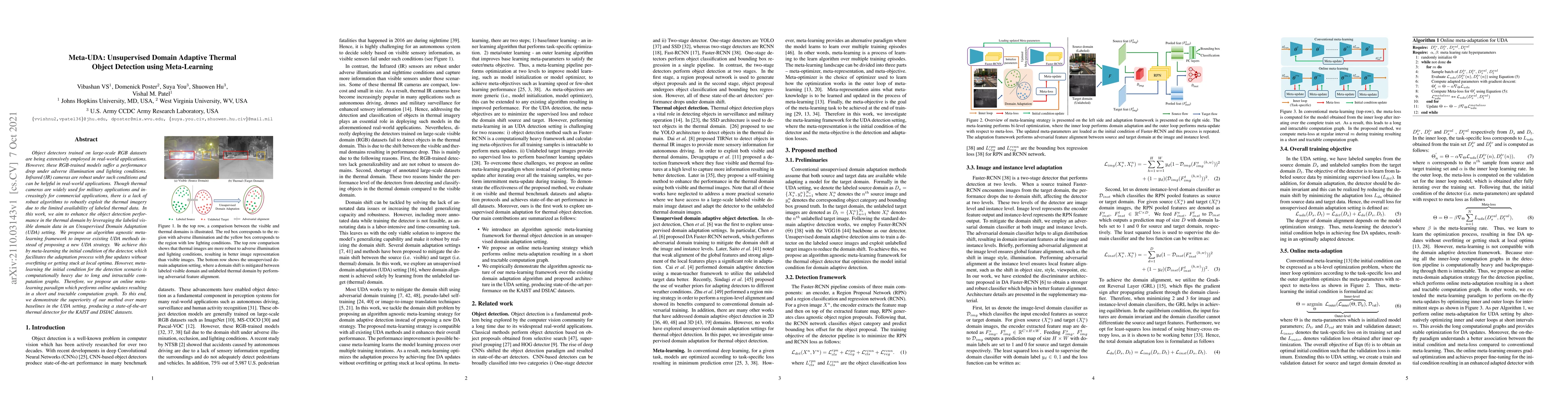 Object detectors trained on large-scale RGB datasets are being extensively employed in real-world applications. However, these RGB-trained models suffer a performance drop under adverse illumination and lighting conditions. Infrared (IR) cameras are robust under such conditions and can be helpful in real-world applications. Though thermal cameras are widely used for military applications and increasingly for commercial applications, there is a lack of robust algorithms to robustly exploit the thermal imagery due to the limited availability of labeled thermal data. In this work, we aim to enhance the object detection performance in the thermal domain by leveraging the labeled visible domain data in an Unsupervised Domain Adaptation (UDA) setting. We propose an algorithm agnostic meta-learning framework to improve existing UDA methods instead of proposing a new UDA strategy. We achieve this by meta-learning the initial condition of the detector, which facilitates the adaptation process with fine updates without overfitting or getting stuck at local optima. However, meta-learning the initial condition for the detection scenario is computationally heavy due to long and intractable computation graphs. Therefore, we propose an online meta-learning paradigm which performs online updates resulting in a short and tractable computation graph. To this end, we demonstrate the superiority of our method over many baselines in the UDA setting, producing a state-of-the-art thermal detector for the KAIST and DSIAC datasets.