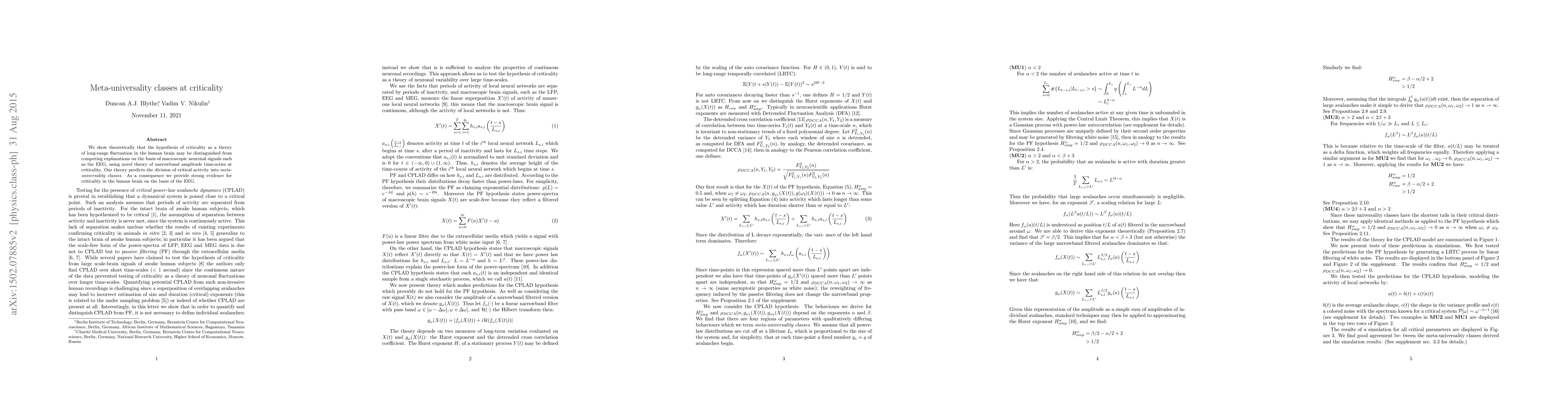 Inferring the presence of critical dynamics from continuous measure- ments is a challenging problem. We solve this problem by showing that continuous narrowband dynamics from a critical system exhibit qualita- tively differing behaviors which depend on the universality class; we term each region of critical avalanche parameters which generates qualitatively constant behavior a meta-universality class. This theoretical observation allows us to infer membership of a given meta-universality class and thus yields a robust test for criticality. We validate these theoretical predic- tions in simulations and provide unequivocal evidence for criticality in the human brain on the basis electrophysiological recordings.