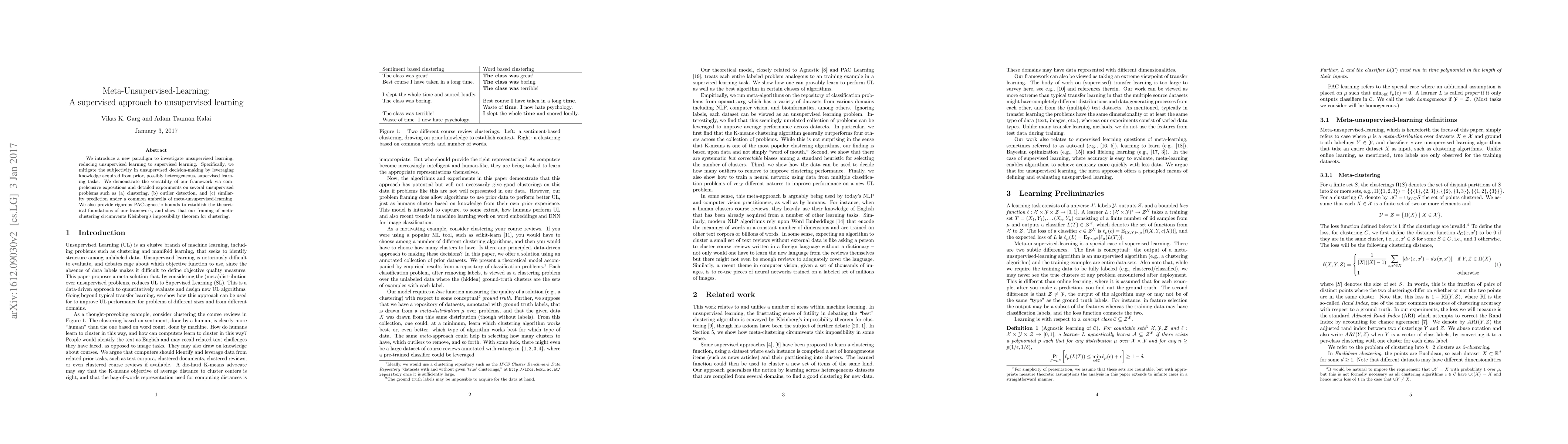 This paper proposes meta-unsupervised-learning, a supervised approach to tackle unsupervised learning tasks, leveraging prior supervised learning to mitigate subjectivity. Experiments on clustering, outlier detection, and similarity prediction demonstrate its effectiveness, and theoretical bounds show it circumvents Kleinberg's impossibility theorem.