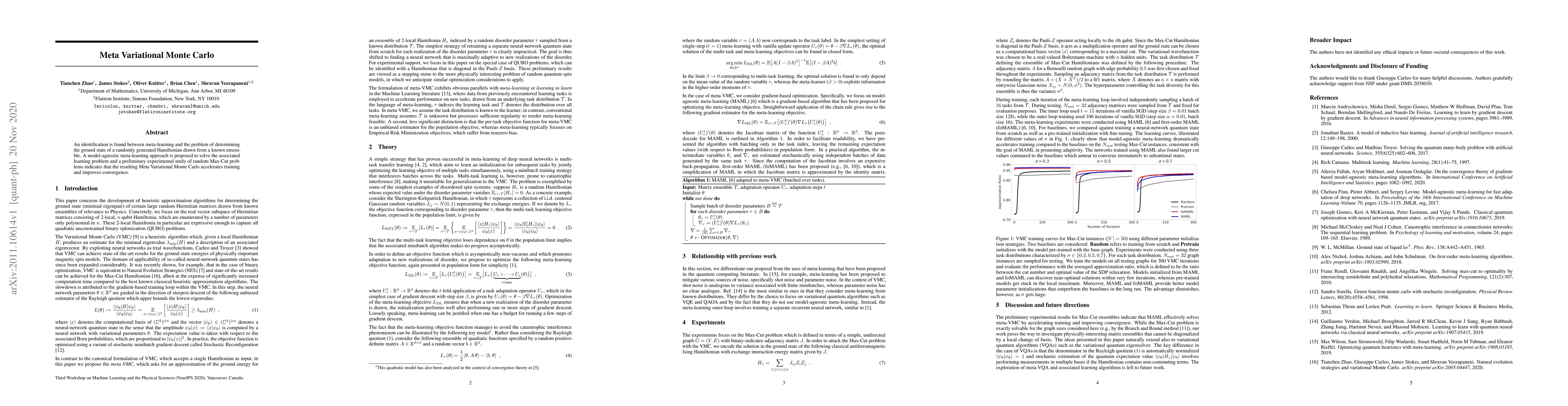 An identification is found between meta-learning and the problem of determining the ground state of a randomly generated Hamiltonian drawn from a known ensemble. A model-agnostic meta-learning approach is proposed to solve the associated learning problem and a preliminary experimental study of random Max-Cut problems indicates that the resulting Meta Variational Monte Carlo accelerates training and improves convergence.