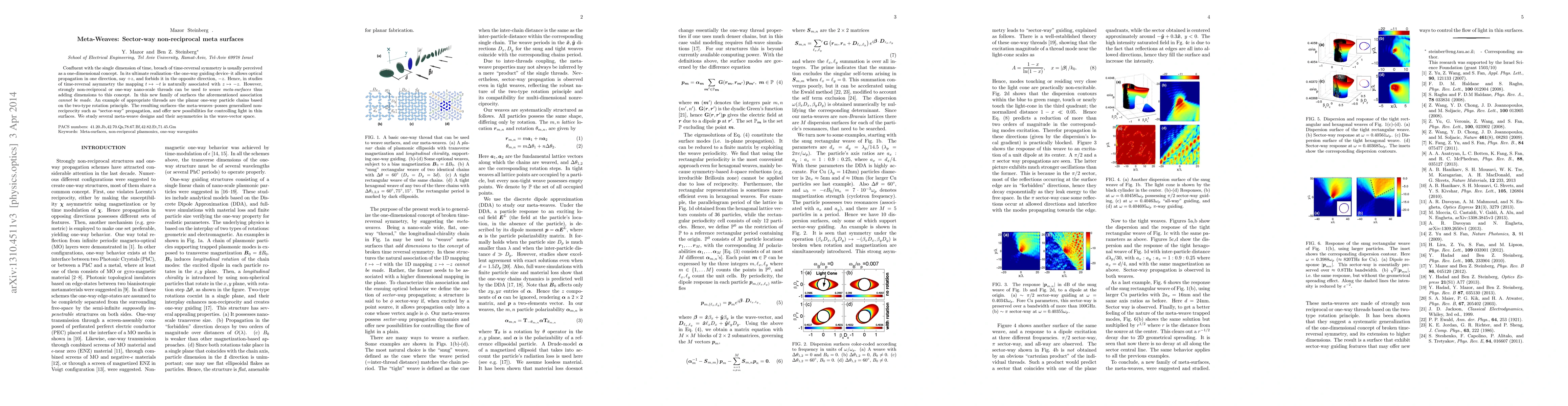 Confluent with the single dimension of time, breach of time-reversal symmetry is usually perceived as a one-dimensional concept. In its ultimate realization--the one-way guiding device--it allows optical propagation in one direction, say $+z$, and forbids it in the opposite direction, $-z$. Hence, in studies of time-reversal asymmetry the mapping $t\mapsto -t$ is naturally associated with $z\mapsto -z$. However, strongly non-reciprocal or one-way nano-scale threads can be used \emph{to weave meta-surfaces} thus adding dimensions to this concept. In this new family of surfaces the aforementioned association \emph{cannot be made}. An example of appropriate threads are the planar one-way particle chains based on the two-type rotation principle. The resulting surfaces--the meta-weaves--posses generalized non-reciprocity such as "sector-way" propagation, and offer new possibilities for controlling light in thin surfaces. We study several meta-weave designs and their asymmetries in the wave-vector space.