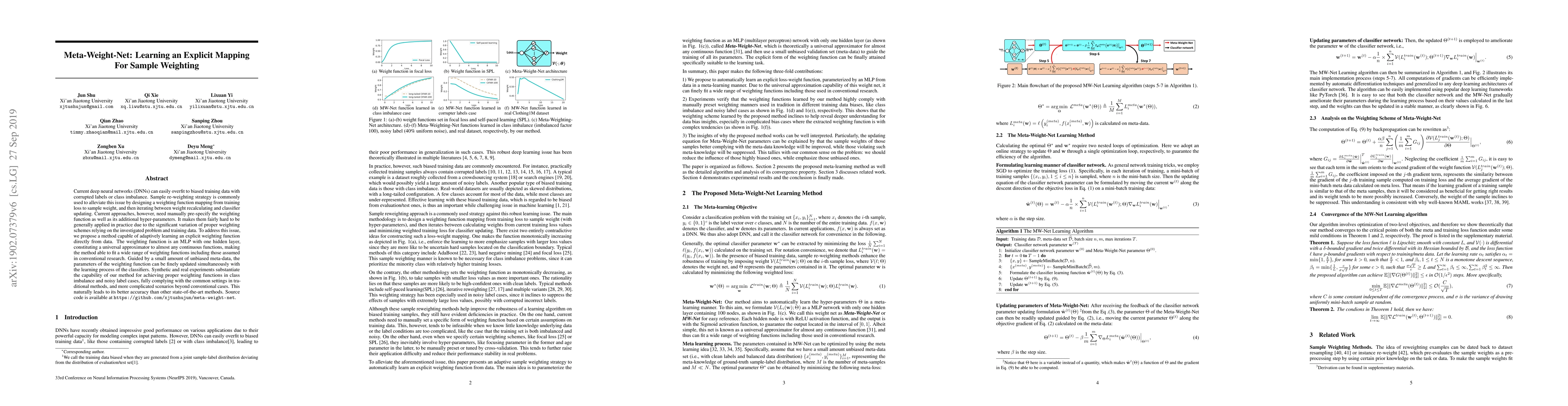 Current deep neural networks (DNNs) can easily overfit to biased training data with corrupted labels or class imbalance. Sample re-weighting strategy is commonly used to alleviate this issue by designing a weighting function mapping from training loss to sample weight, and then iterating between weight recalculating and classifier updating. Current approaches, however, need manually pre-specify the weighting function as well as its additional hyper-parameters. It makes them fairly hard to be generally applied in practice due to the significant variation of proper weighting schemes relying on the investigated problem and training data. To address this issue, we propose a method capable of adaptively learning an explicit weighting function directly from data. The weighting function is an MLP with one hidden layer, constituting a universal approximator to almost any continuous functions, making the method able to fit a wide range of weighting functions including those assumed in conventional research. Guided by a small amount of unbiased meta-data, the parameters of the weighting function can be finely updated simultaneously with the learning process of the classifiers. Synthetic and real experiments substantiate the capability of our method for achieving proper weighting functions in class imbalance and noisy label cases, fully complying with the common settings in traditional methods, and more complicated scenarios beyond conventional cases. This naturally leads to its better accuracy than other state-of-the-art methods.