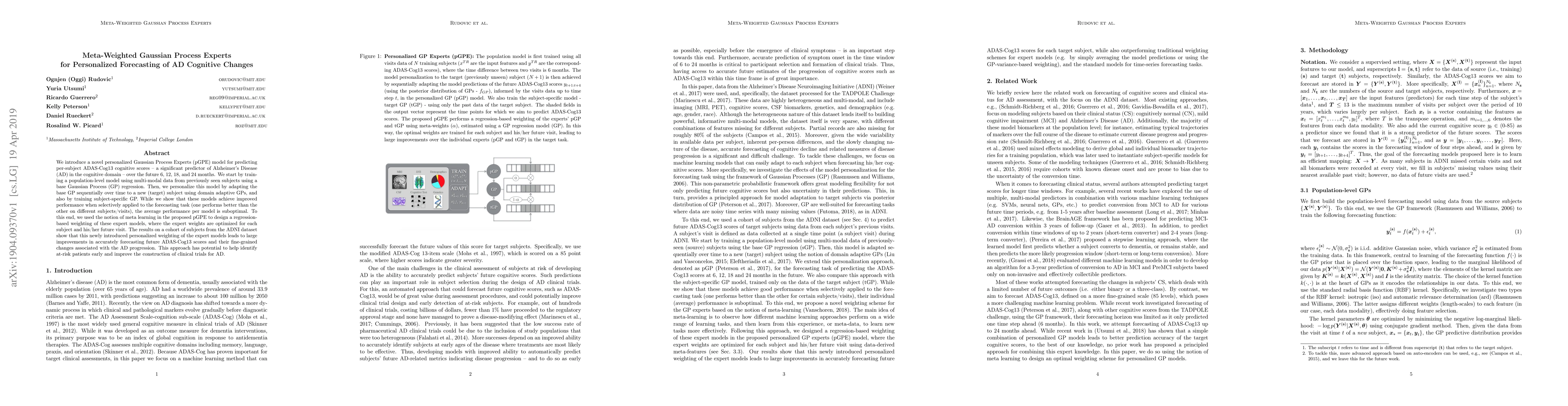 This paper proposes a meta-weighted Gaussian Process Experts (pGPE) model to personalize the forecasting of Alzheimer's Disease cognitive changes using ADAS-Cog13 scores. The model combines population-level and subject-specific GPs, optimized through meta-learning to improve prediction accuracy for individual patients.