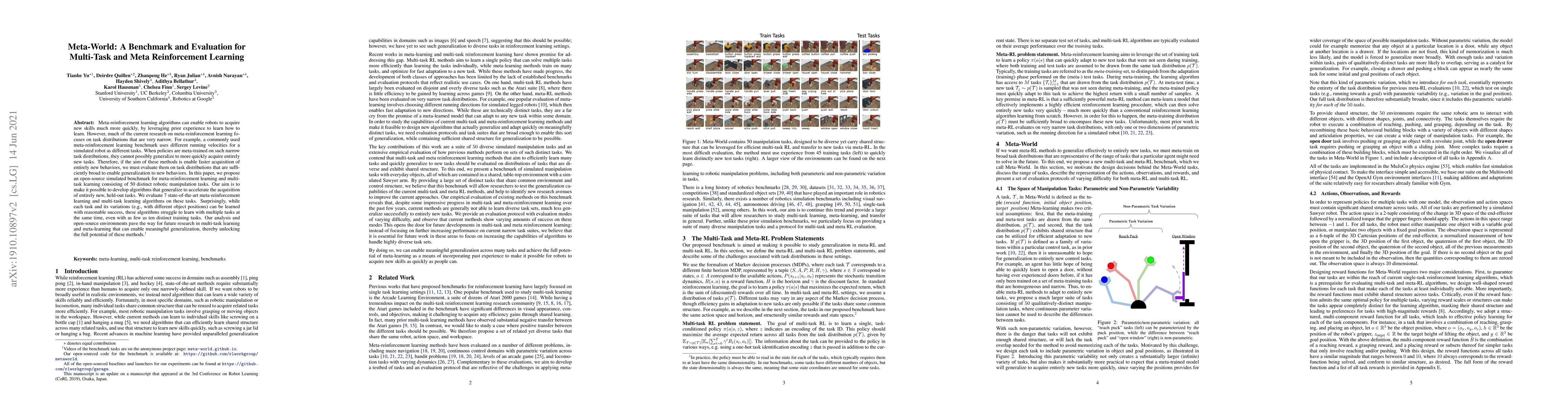 This paper introduces Meta-World, a benchmark for evaluating multi-task and meta-reinforcement learning algorithms across 50 diverse robotic manipulation tasks. The study reveals that current state-of-the-art algorithms struggle to generalize across multiple tasks, highlighting the need for broader task distributions to enable true generalization and faster acquisition of new skills.