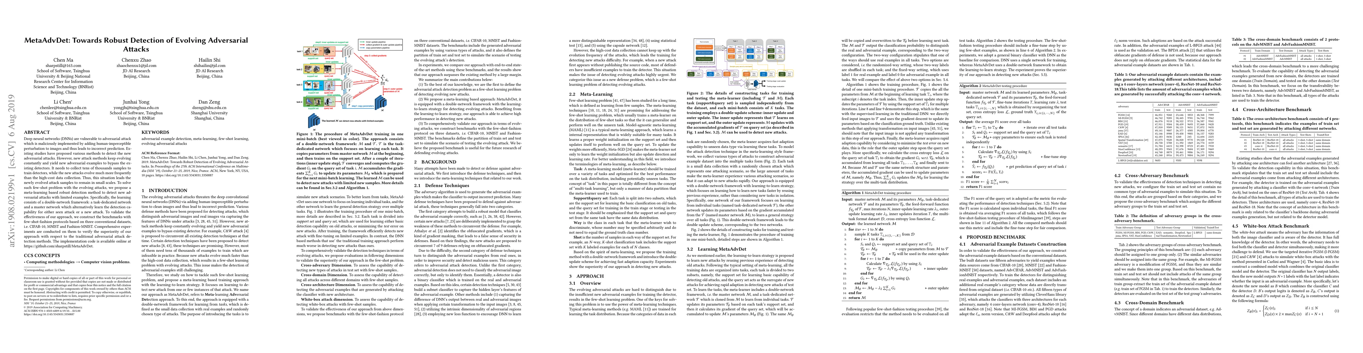 The paper proposes MetaAdvDet, a meta-learning-based method to detect evolving adversarial attacks using limited examples. It employs a double-network framework to alternately train a task-specific network and a master network, demonstrating superior performance on few-shot adversarial attack detection benchmarks constructed from CIFAR-10, MNIST, and Fashion-MNIST datasets.