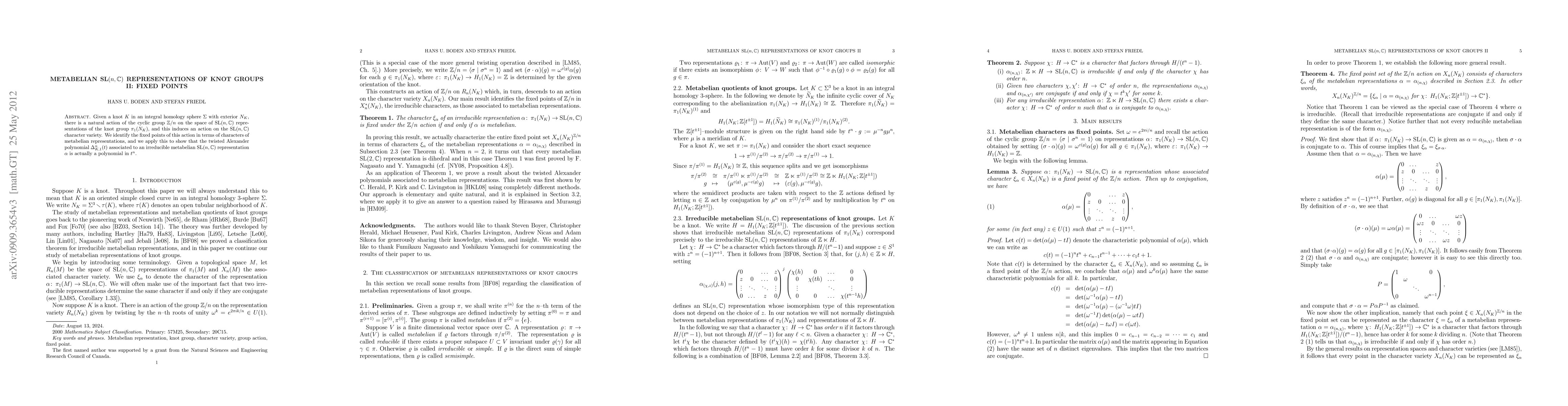 This paper studies the fixed points of an action of the cyclic group Z/n on the SL(n,C) character variety of knot groups, revealing that these fixed points correspond to characters of metabelian representations. It demonstrates that the twisted Alexander polynomial linked with irreducible metabelian SL(n,C) representations is a polynomial in t^n.