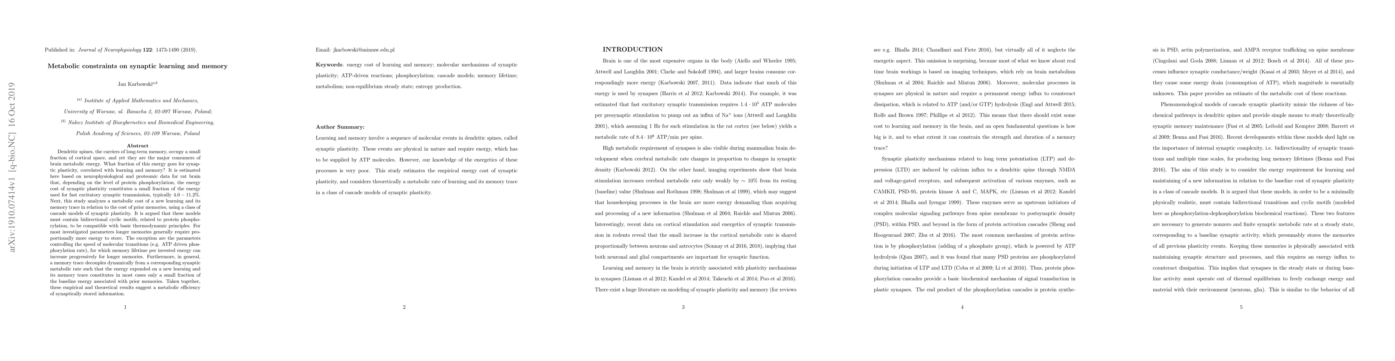 Dendritic spines, the carriers of long-term memory, occupy a small fraction of cortical space, and yet they are the major consumers of brain metabolic energy. What fraction of this energy goes for synaptic plasticity, correlated with learning and memory? It is estimated here based on neurophysiological and proteomic data for rat brain that, depending on the level of protein phosphorylation, the energy cost of synaptic plasticity constitutes a small fraction of the energy used for fast excitatory synaptic transmission, typically $4.0-11.2 \%$. Next, this study analyzes a metabolic cost of a new learning and its memory trace in relation to the cost of prior memories, using a class of cascade models of synaptic plasticity. It is argued that these models must contain bidirectional cyclic motifs, related to protein phosphorylation, to be compatible with basic thermodynamic principles. For most investigated parameters longer memories generally require proportionally more energy to store. The exception are the parameters controlling the speed of molecular transitions (e.g. ATP driven phosphorylation rate), for which memory lifetime per invested energy can increase progressively for longer memories. Furthermore, in general, a memory trace decouples dynamically from a corresponding synaptic metabolic rate such that the energy expended on a new learning and its memory trace constitutes in most cases only a small fraction of the baseline energy associated with prior memories. Taken together, these empirical and theoretical results suggest a metabolic efficiency of synaptically stored information.