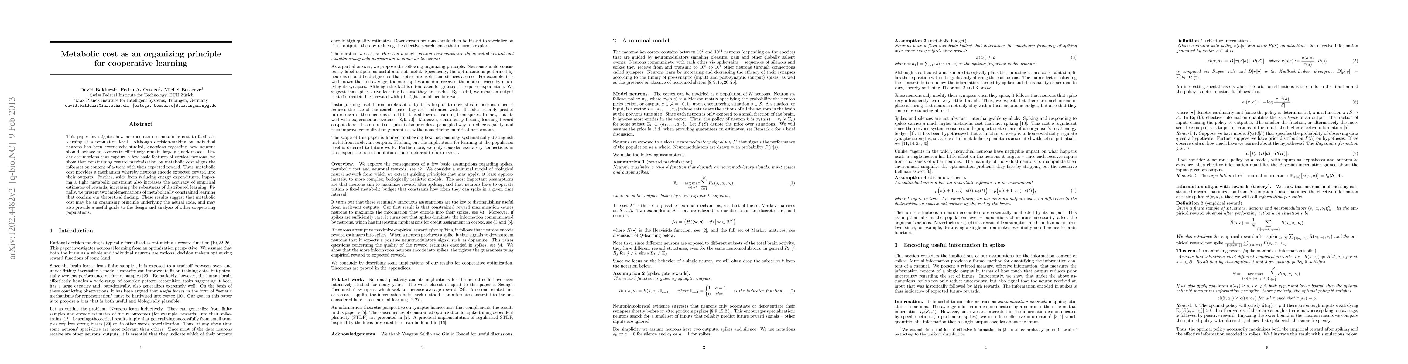 This paper explores how metabolic cost can guide cooperative learning among neurons, demonstrating that it aligns the information content of actions with their expected rewards, thereby enhancing learning efficiency and robustness. Theoretical findings are supported by two practical implementations, suggesting metabolic cost as a potential organizing principle for neural cooperation.
