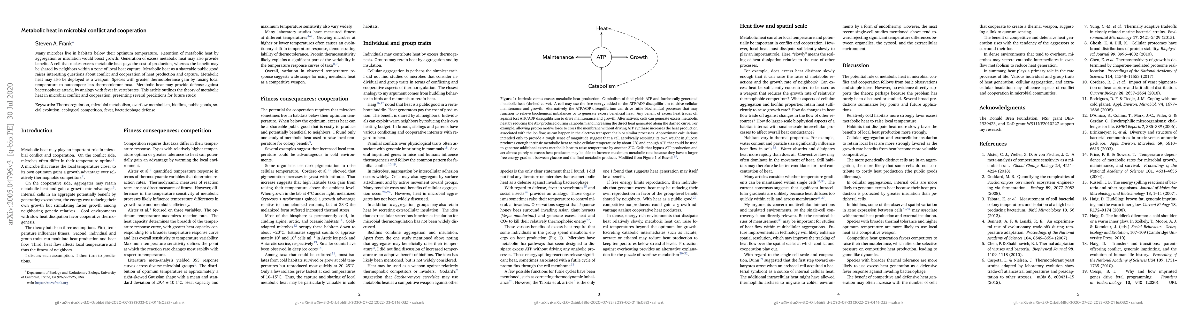 Many microbes live in habitats below their optimum temperature. Retention of metabolic heat by aggregation or insulation would boost growth. Generation of excess metabolic heat may also provide benefit. A cell that makes excess metabolic heat pays the cost of production, whereas the benefit may be shared by neighbors within a zone of local heat capture. Metabolic heat as a shareable public good raises interesting questions about conflict and cooperation of heat production and capture. Metabolic heat may also be deployed as a weapon. Species with greater thermotolerance gain by raising local temperature to outcompete less thermotolerant taxa. Metabolic heat may provide defense against bacteriophage attack, by analogy with fever in vertebrates. This article outlines the theory of metabolic heat in microbial conflict and cooperation, presenting several predictions for future study.