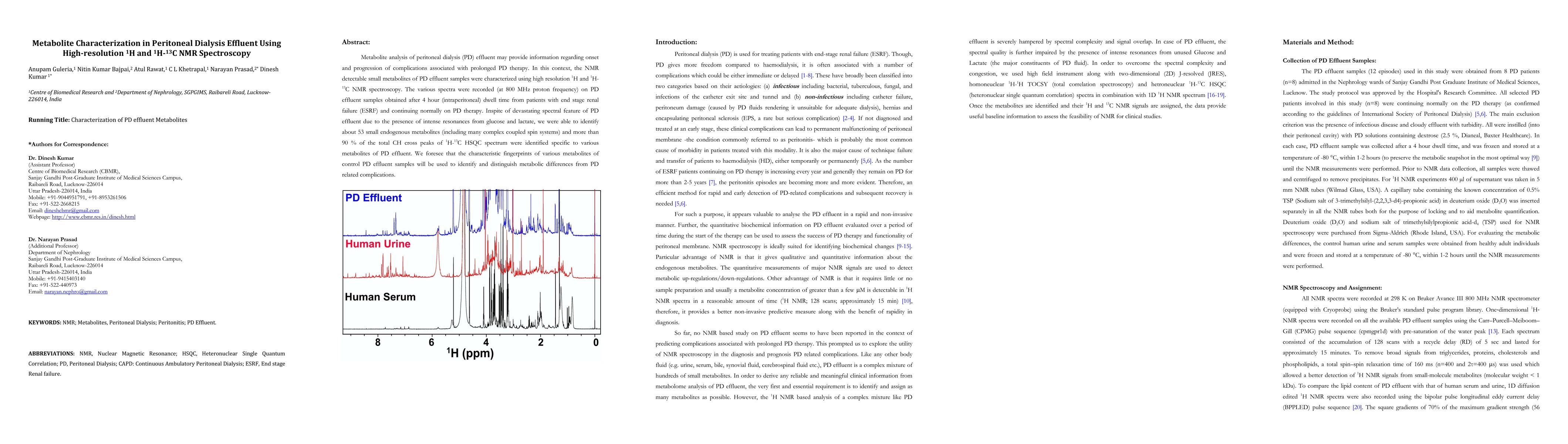 Researchers used NMR spectroscopy to analyze peritoneal dialysis effluent, identifying 53 small metabolites that may help distinguish metabolic differences from PD-related complications. The study aims to create a 'fingerprint' of normal metabolite patterns in PD effluent.