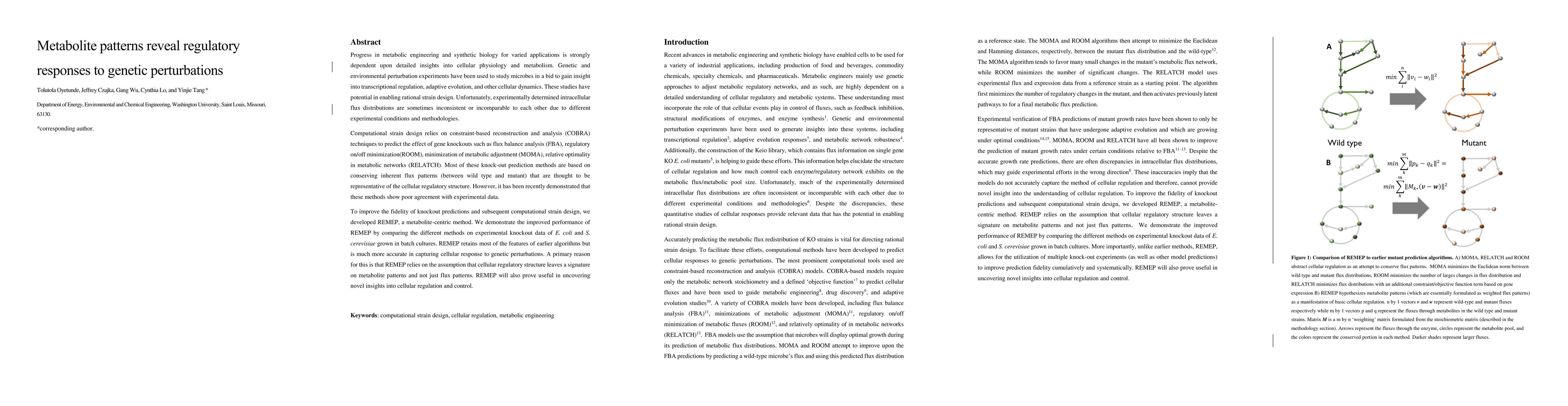 Genetic and environmental perturbation experiments have been used to study microbes in a bid to gain insight into transcriptional regulation, adaptive evolution, and other cellular dynamics. These studies have potential in enabling rational strain design. Unfortunately, experimentally determined intracellular flux distribution are often inconsistent or incomparable due to different experimental conditions and methodologies. Computational strain design relies on constraint-based reconstruction and analysis (COBRA) techniques to predict the effect of gene knockouts such as flux balance analysis (FBA), regulatory on/off minimization(ROOM), minimization of metabolic adjustment (MOMA), relative optimality in metabolic networks (RELATCH). Most of these knock-out prediction methods are based on conserving inherent flux patterns (between wild type and mutant) that are thought to be representative of the cellular regulatory structure. However, it has been recently demonstrated that these methods show poor agreement with experimental data. To improve the fidelity of knockout predictions and subsequent computational strain design, we developed REMEP, a metabolite-centric method. We demonstrate the improved performance of REMEP by comparing the different methods on experimental knockout data of E. coli, and S. cerevisiae grown in batch cultures. REMEP retains most of the features of earlier algorithms but is much more accurate in capturing cellular responses to genetic perturbations. A primary reason for this is that REMEP relies on the assumption that cellular regulatory structure leaves a signature on metabolite patterns and not just flux patterns. REMEP will also prove useful in uncovering novel insights into cellular regulation and control.