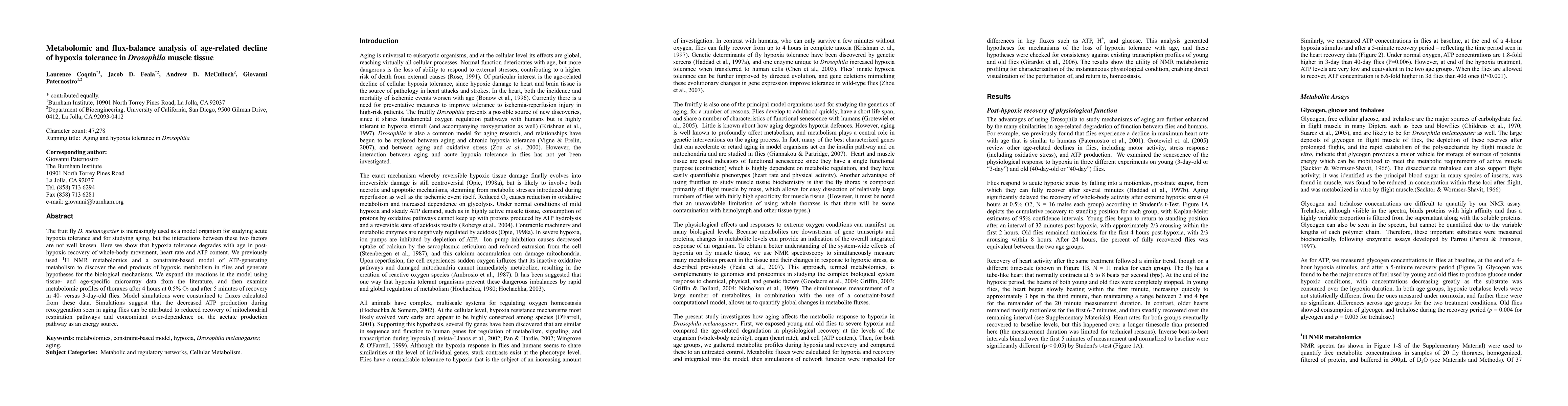 The fruit fly D. melanogaster is increasingly used as a model organism for studying acute hypoxia tolerance and for studying aging, but the interactions between these two factors are not well known. Here we show that hypoxia tolerance degrades with age in post-hypoxic recovery of whole-body movement, heart rate and ATP content. We previously used 1H NMR metabolomics and a constraint-based model of ATP-generating metabolism to discover the end products of hypoxic metabolism in flies and generate hypotheses for the biological mechanisms. We expand the reactions in the model using tissue- and age-specific microarray data from the literature, and then examine metabolomic profiles of thoraxes after 4 hours at 0.5% O2 and after 5 minutes of recovery in 40- versus 3-day-old flies. Model simulations were constrained to fluxes calculated from these data. Simulations suggest that the decreased ATP production during reoxygenation seen in aging flies can be attributed to reduced recovery of mitochondrial respiration pathways and concomitant over-dependence on the acetate production pathway as an energy source.