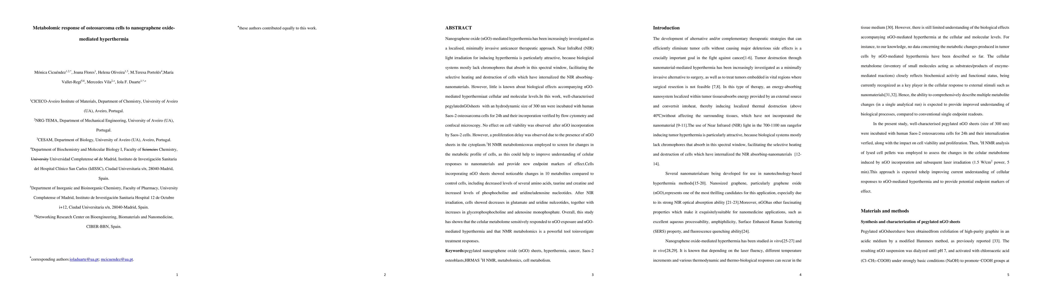 This study investigates the metabolomic response of osteosarcoma cells to nanographene oxide (nGO)-mediated hyperthermia. Cells showed a proliferation delay and distinct metabolic changes, including decreased amino acids and increased phosphocholine, after nGO incorporation and NIR irradiation, highlighting the potential of NMR metabolomics to elucidate cellular responses to nanomaterials.