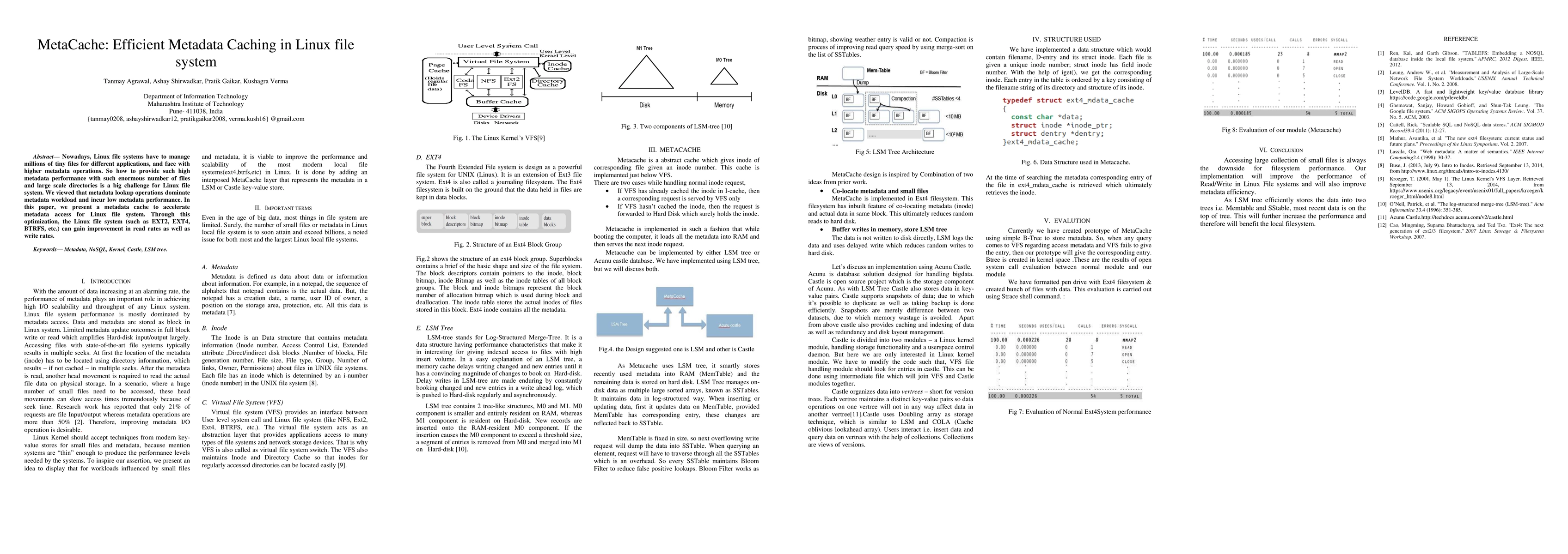 Title: MetaCache: Efficient Metadata Caching in Linux file system Summary: This paper introduces MetaCache, a metadata caching mechanism designed to enhance performance in Linux file systems by optimizing metadata lookup operations, resulting in improved read and write rates for file systems like EXT2, EXT4, and BTRFS.