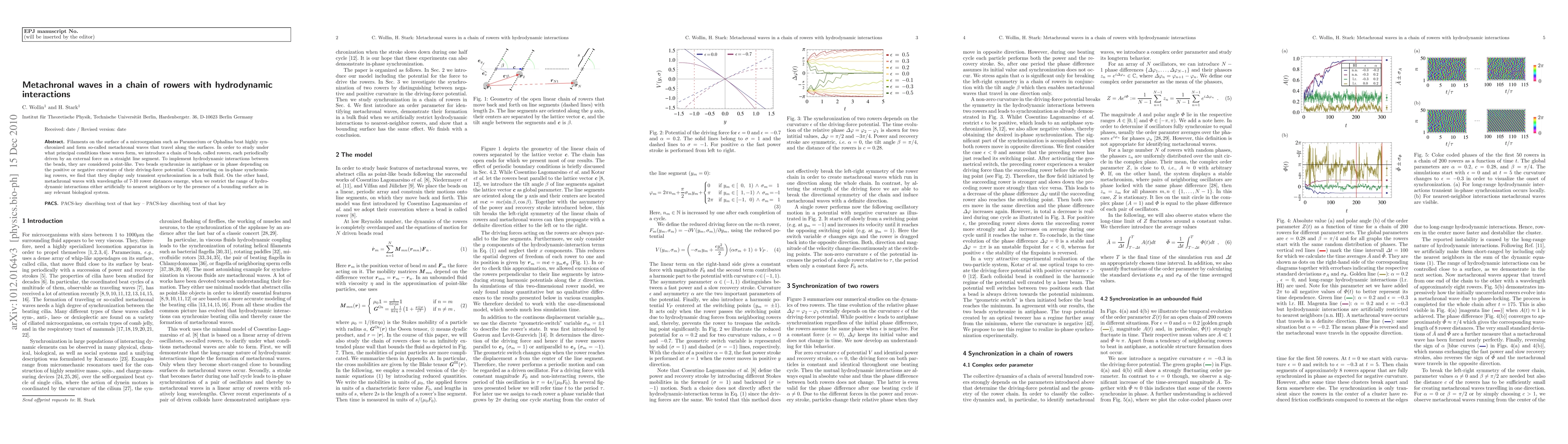 Researchers studied how synchronized rowers (beads) in a chain can form metachronal waves with specific wavelengths when hydrodynamic interactions are restricted to nearest neighbors or a bounding surface, unlike transient synchronization in bulk fluids.