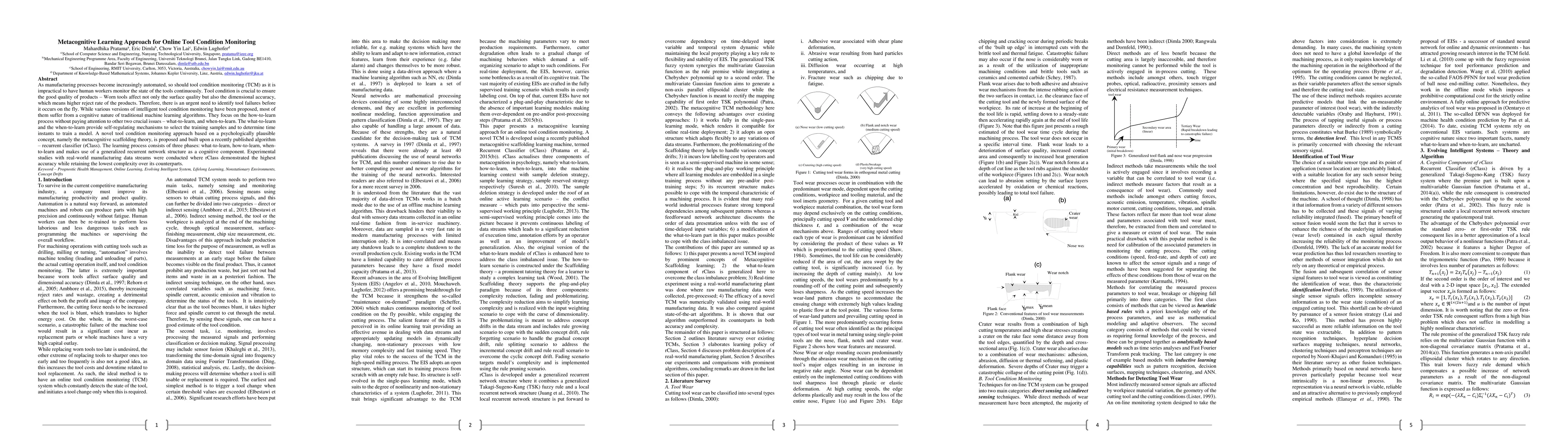 This paper proposes a metacognitive learning approach for online tool condition monitoring in automated manufacturing, addressing the limitations of traditional machine learning by focusing on what and when to learn to improve model accuracy and reduce complexity. The method, based on the metacognitive scaffolding theory and recurrent classifier, outperformed other methods in experimental studies using real-world data.