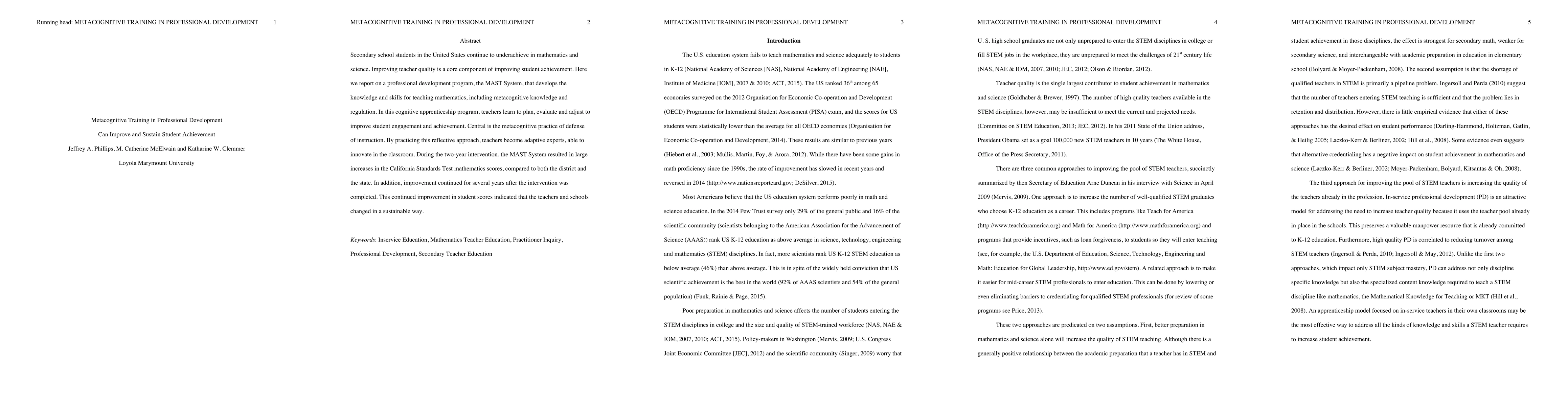 Secondary school students in the United States continue to underachieve in mathematics and science. Improving teacher quality is a core component of improving student achievement. Here we report on a professional development program, the MAST System, that develops the knowledge and skills for teaching mathematics, including metacognitive knowledge and regulation. In this cognitive apprenticeship program, teachers learn to plan, evaluate and adjust to improve student engagement and achievement. Central is the metacognitive practice of defense of instruction. By practicing this reflective approach, teachers become adaptive experts, able to innovate in the classroom. During the two-year intervention, the MAST System resulted in large increases in the California Standards Test mathematics scores, compared to both the district and the state. In addition, improvement continued for several years after the intervention was completed. This continued improvement in student scores indicated that the teachers and schools changed in a sustainable way.