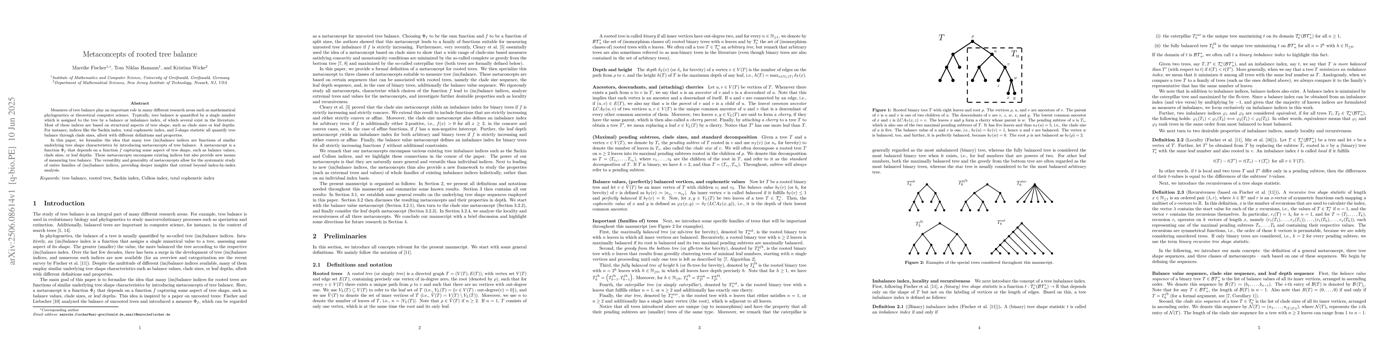 The paper introduces metaconcepts of rooted tree balance, formalizing the idea that many tree (im)balance indices are functions of similar underlying tree shape characteristics, using metaconcepts $\Phi_f$ dependent on a function $f$ capturing aspects like balance values, clade sizes, or leaf depths.