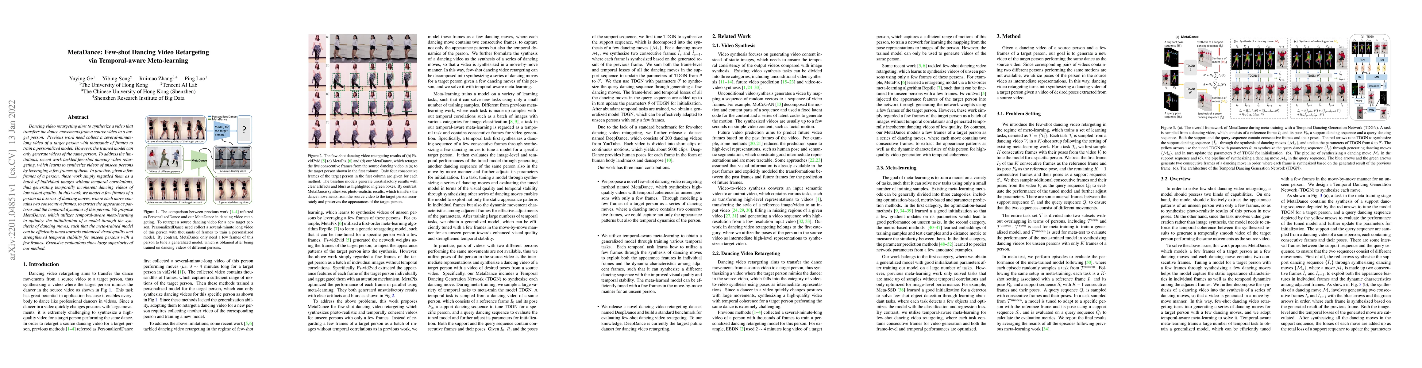 MetaDance employs temporal-aware meta-learning to optimize model initialization for few-shot dancing video retargeting, enhancing visual quality and temporal stability for unseen individuals with minimal input frames. This approach synthesizes dancing moves from consecutive frames, achieving superior results compared to traditional methods.